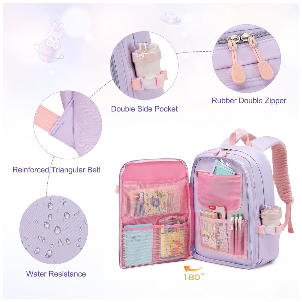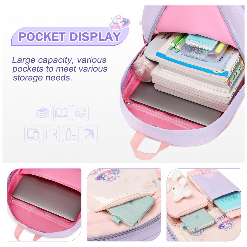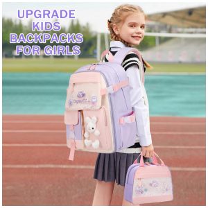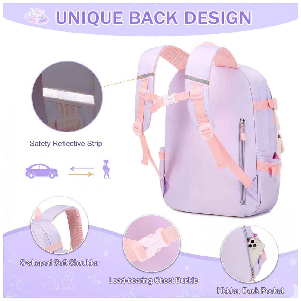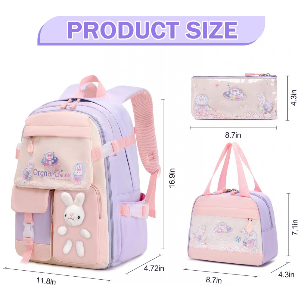 Mochila escolar infantil FIXITOK coelho kawaii 3 peças com lancheira térmica e estojo nylon impermeável roxa e rosa