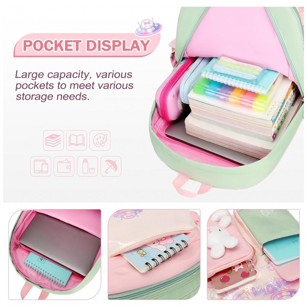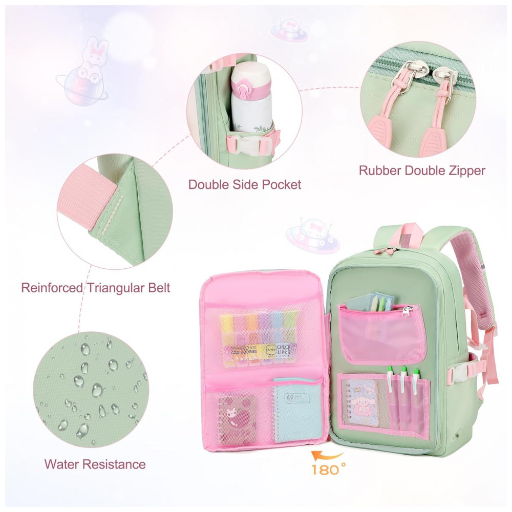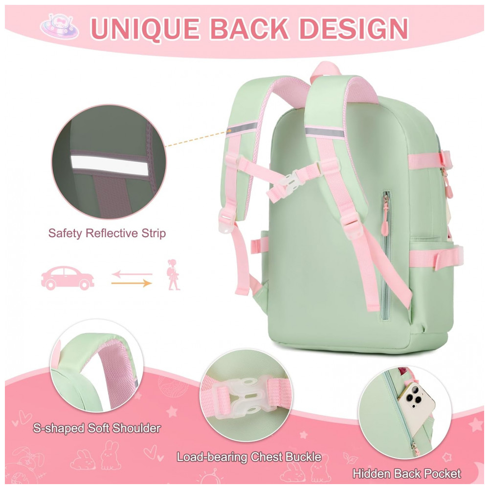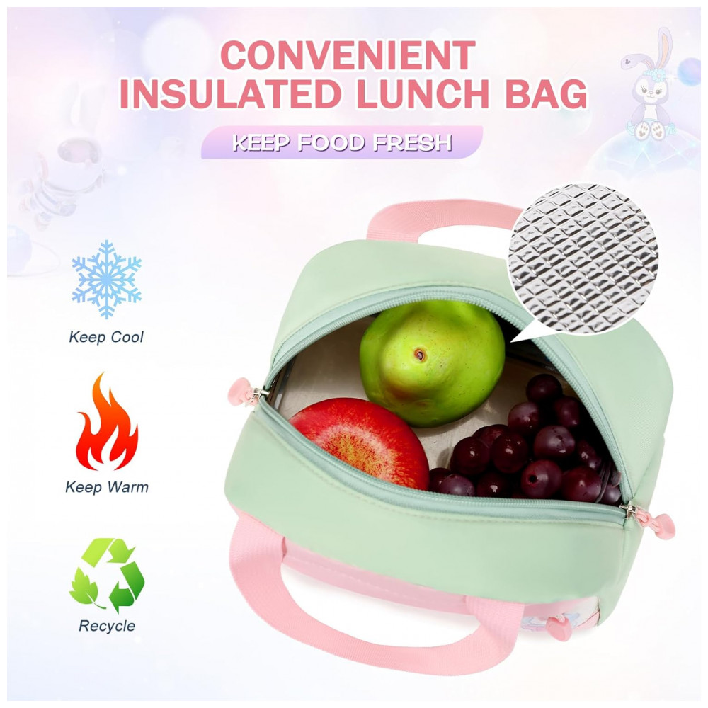 Mochila escolar infantil FIXITOK coelho kawaii 3 peças com lancheira térmica e estojo nylon impermeável verde e rosa