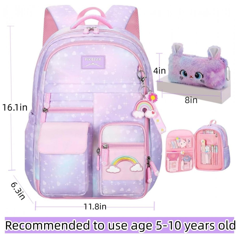 Mochila escolar kistou com estampa de arco-íris em cores vibrantes, desenvolvida para meninas em idade escolar e indicada para uso em ensino fundamental, passeios, viagens curtas e atividades do dia a dia. O conjunto inclui uma mochila e um estojo de pelúcia coordenado, combinando visual lúdico com organização interna para materiais escolares, eletrônicos e objetos pessoais.