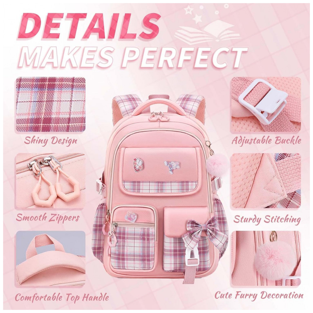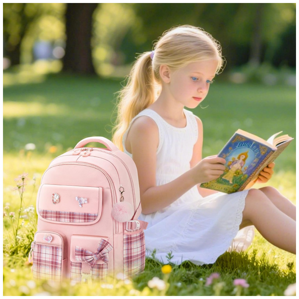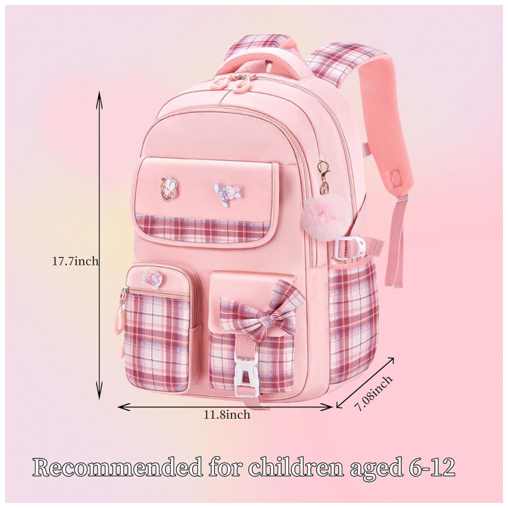 Mochila escolar infantil kistou desenvolvida para meninas de aproximadamente 5 a 12 anos, com estampa quadriculada em tons de rosa e branco e laço decorativo frontal, indicada para uso em escola, passeios e atividades diárias. O visual combina cores suaves e aplicações de laço com um badge personalizado removível no bolso frontal, conferindo aparência lúdica e diferenciada.