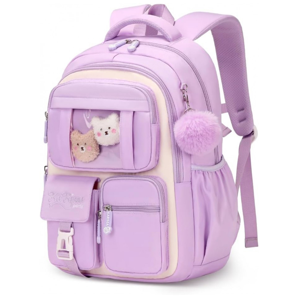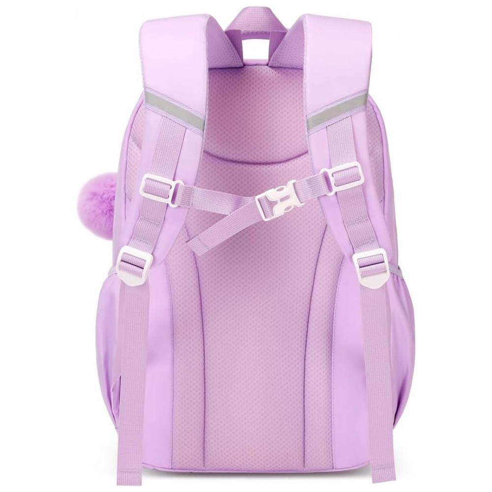 Mochila escolar infantil SPORTBANG kawaii 3 peças grande capacidade com estojo transparente e chaveiro de pompom bege e roxo