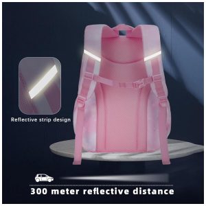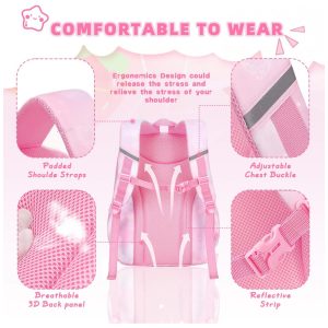 O design utiliza tonalidade rosa com elementos visuais suaves, mantendo aspecto infantil e adequado ao uso escolar. As alças de ombro são acolchoadas e ajustáveis, com espuma espessa e material respirável, complementadas por painel traseiro também acolchoado para maior conforto e melhor distribuição de peso.