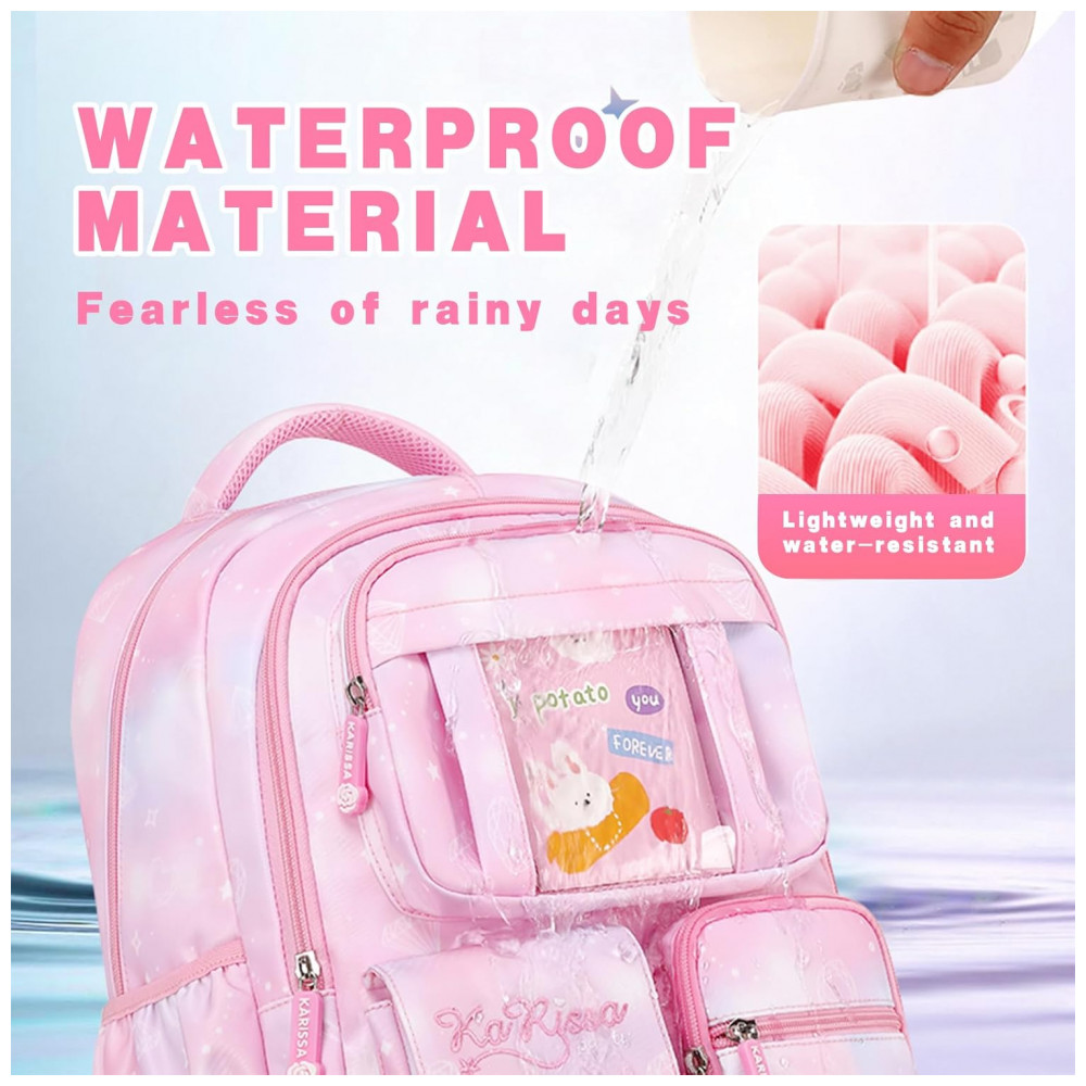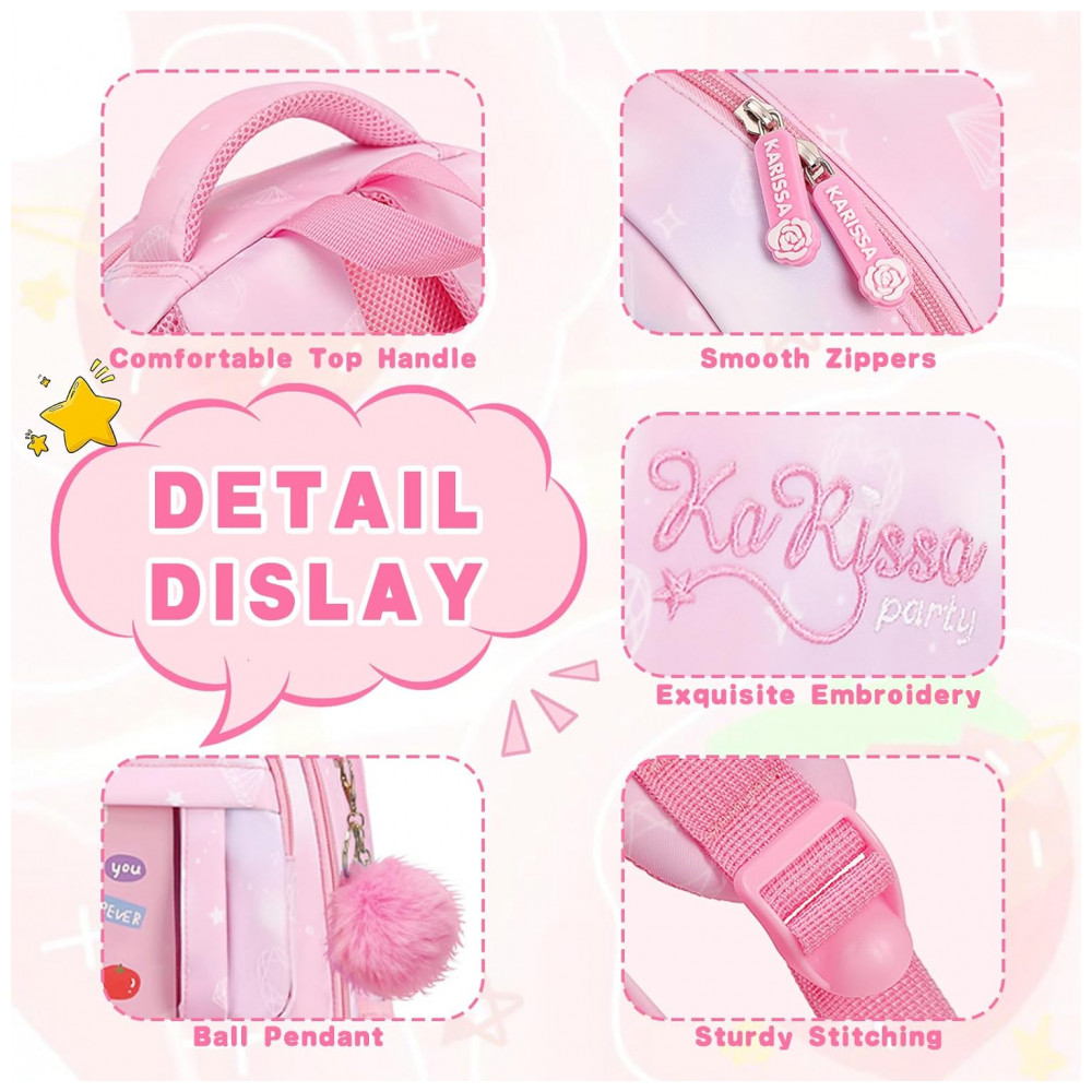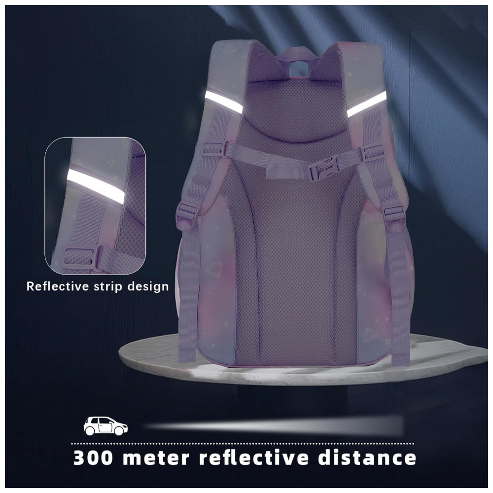 O design utiliza tonalidade roxa e aplicação de detalhes delicados, mantendo aparência infantil e adequada ao ambiente escolar. As alças de ombro são acolchoadas, ajustáveis e produzidas com material respirável, em conjunto com painel traseiro acolchoado para favorecer conforto e melhor distribuição de carga durante o uso prolongado.