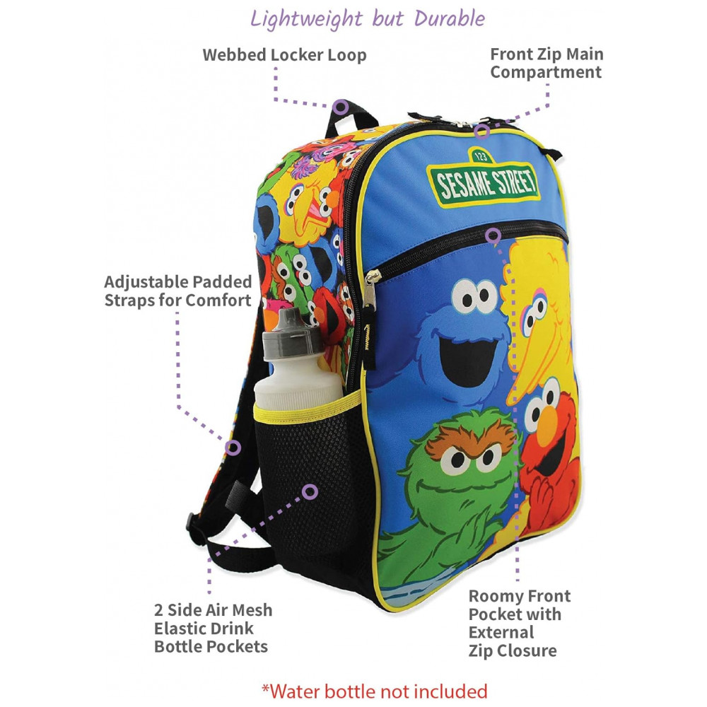 Incluída neste conjunto, há uma mochila elegante de , uma lancheira reutilizável com isolamento fino e dobrável, uma lancheira reutilizável com isolamento fino, um saco de cordão, e um estojo para itens menores. Este conjunto de malas escolares da Vila Sésamo correspondente é o conjunto perfeito de volta às aulas. Esta mochila mede aproximadamente 40 x 30 x