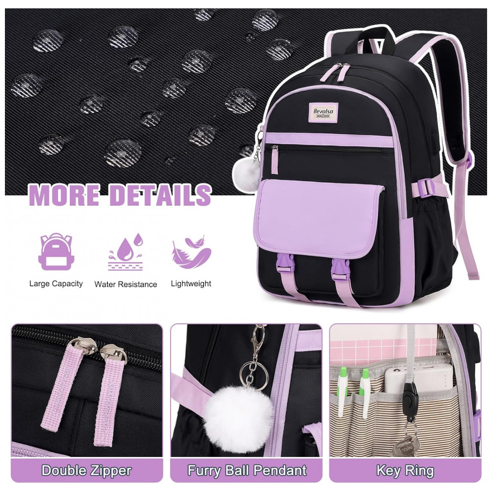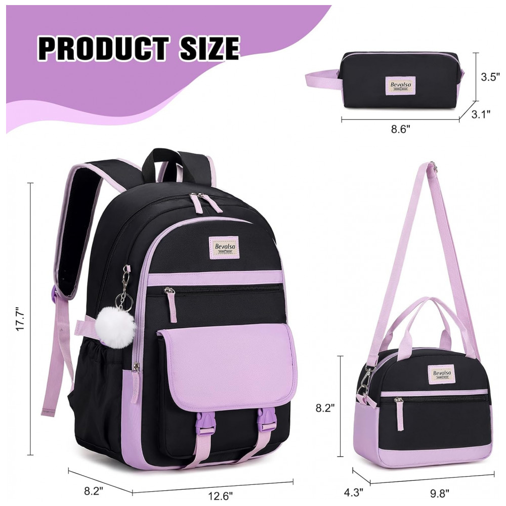 A mochila escolar Bevalsa roxa e preta foi desenvolvida para uso diário de alunas do ensino fundamental ao universitário, com capacidade para notebook de até 39,6 cm e múltiplos compartimentos para livros, cadernos, documentos em formato A4 e acessórios. O conjunto inclui mochila, lancheira com alça tiracolo ajustável e estojo/necessaire, formando um kit 3 em 1 para escola, trabalho ou viagens curtas.