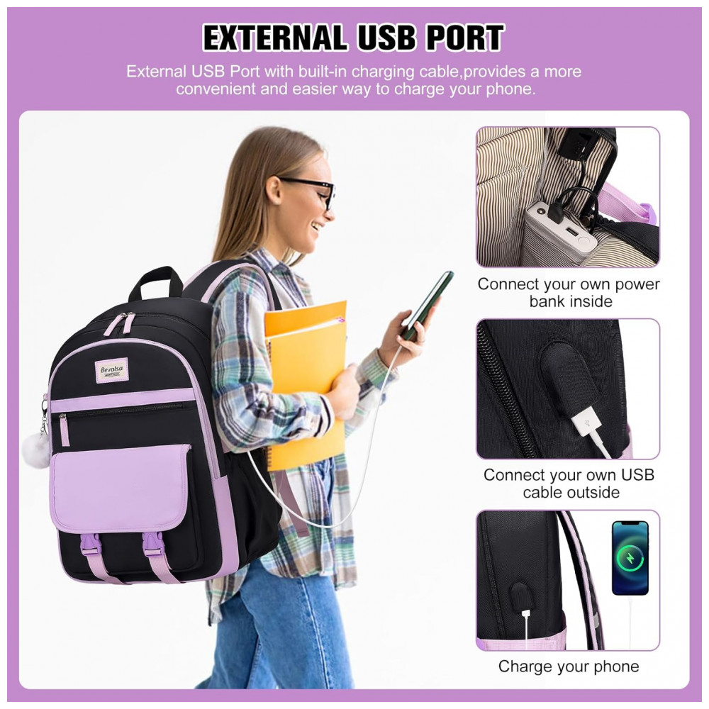 Modelo: Mochila escolar juvenil roxa e preta com porta USB