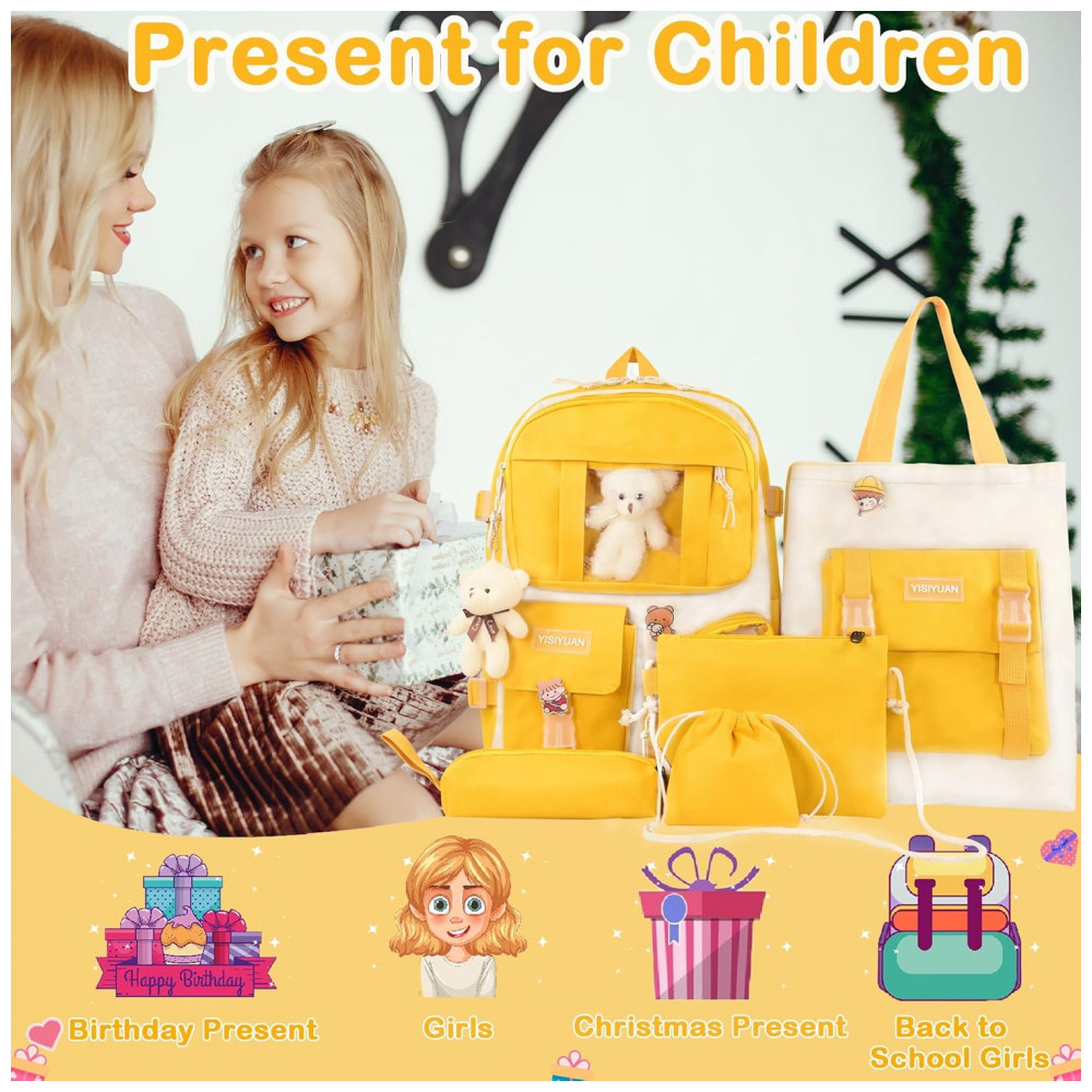 Mochila escolar kawaii Lifelix feminina 5 peças nylon leve com bolsa tiracolo estojo bolsa de mão e porta-moedas amarela