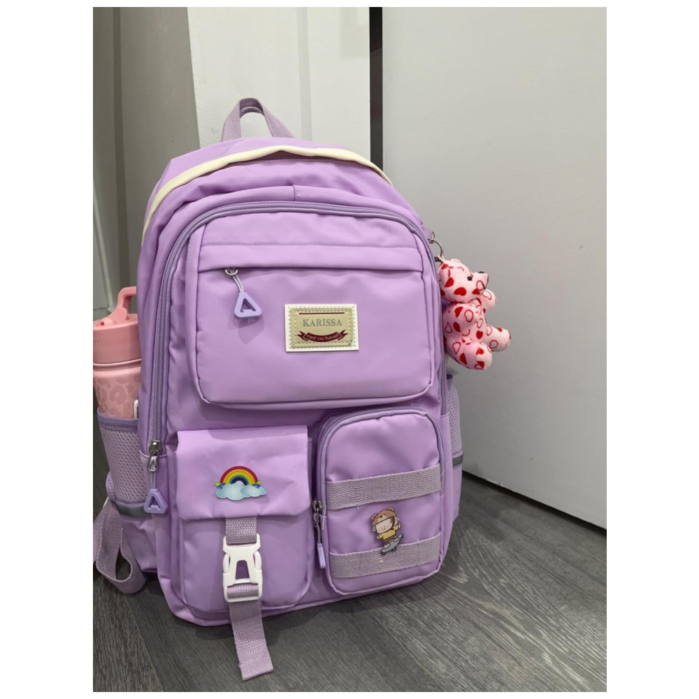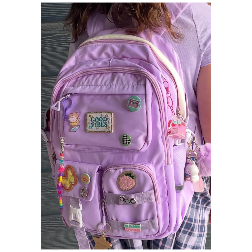 Modelo: Mochila escolar juvenil kawaii com múltiplos bolsos roxa