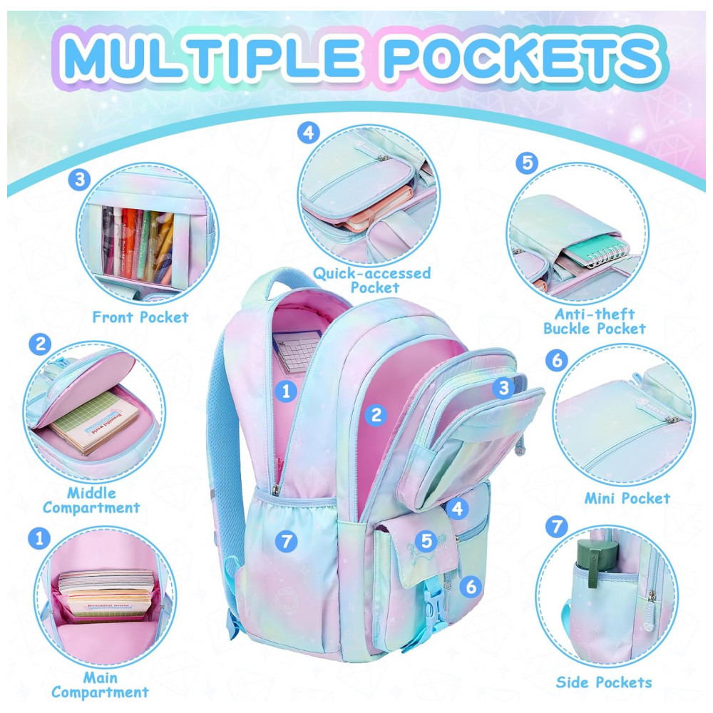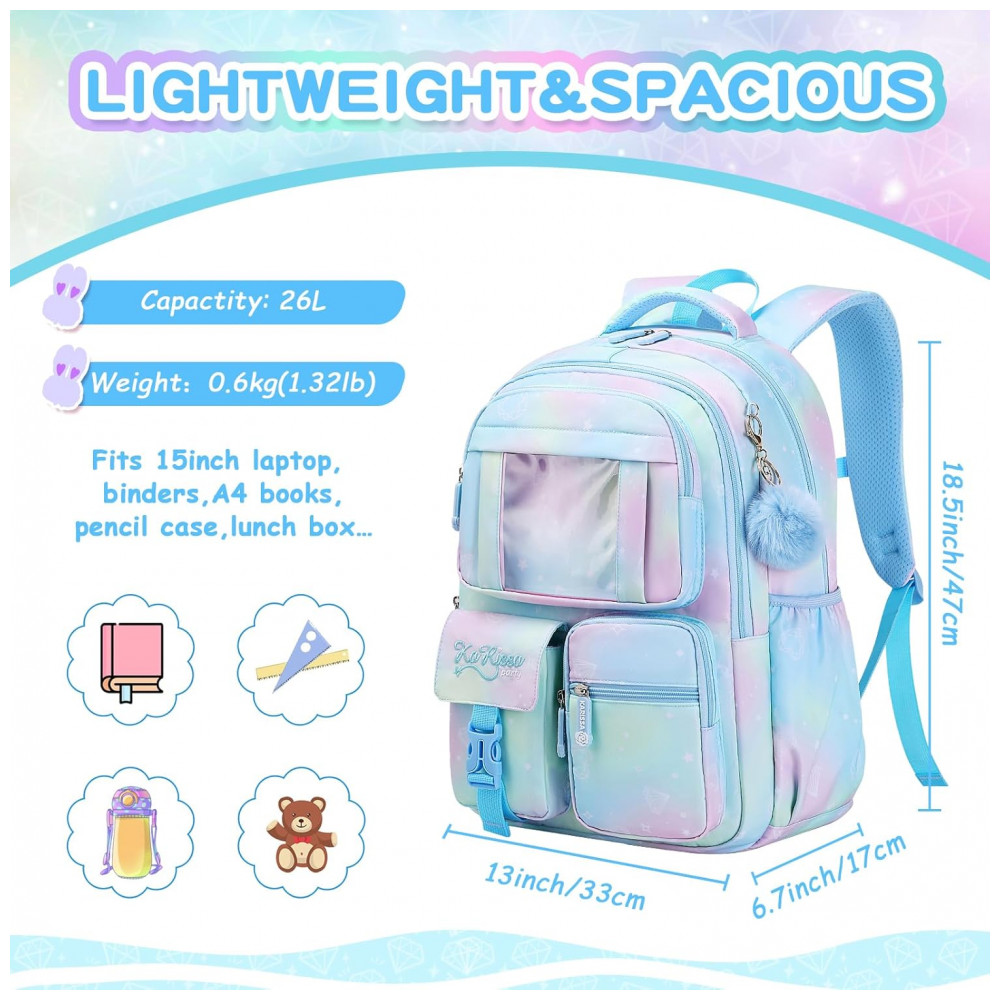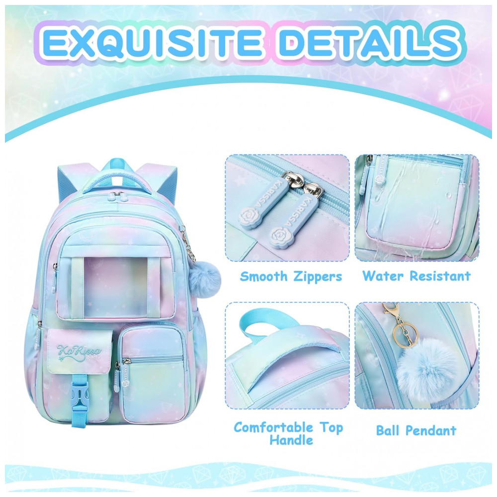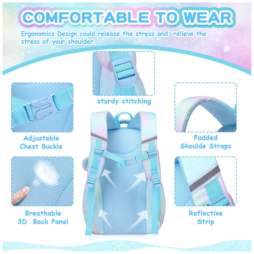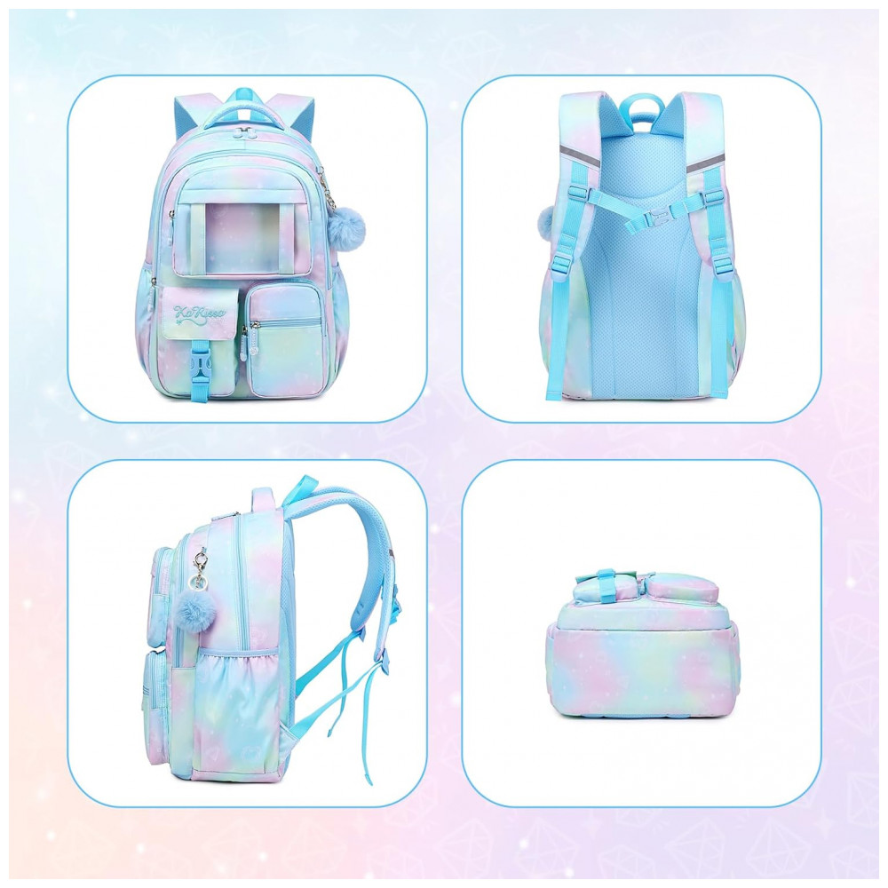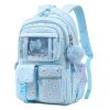 Modelo: Mochila escolar azul para meninas com múltiplos compartimentos