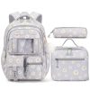 Na parte frontal superior há bolso transparente para pequenos itens de acesso rápido, complementado por três bolsos menores que auxiliam na organização de acessórios e objetos de uso diário. Os bolsos laterais com elástico foram dimensionados para garrafa de água e guarda-chuva compacto. O corpo da mochila é produzido em poliéster espesso com acabamento resistente à água e rasgos, zíperes de abertura suave e costuras reforçadas, voltado para uso frequente em ambiente escolar e em passeios. As alças acolchoadas e o painel traseiro com espuma respirável seguem desenho ergonômico para reduzir a pressão nos ombros, enquanto detalhes refletivos contribuem para maior visibilidade em condições de baixa luminosidade.