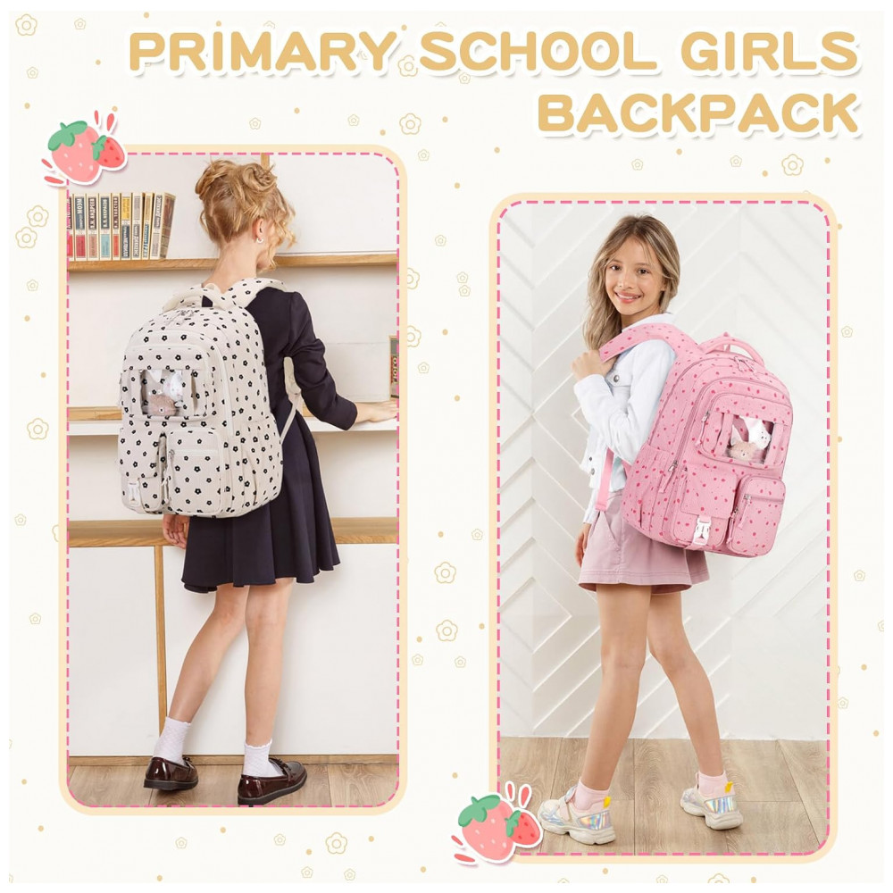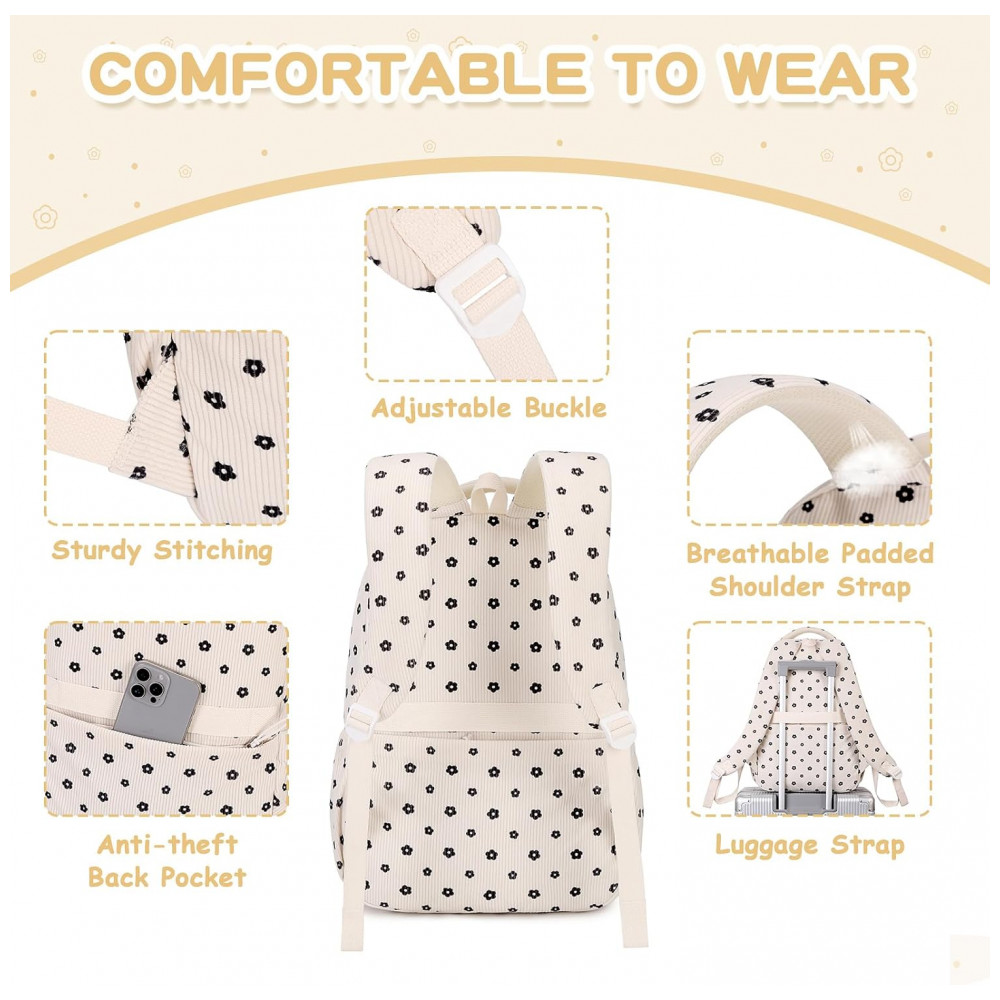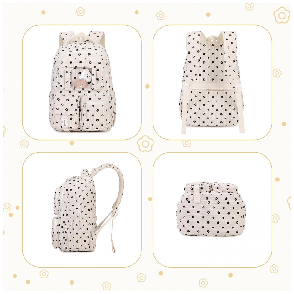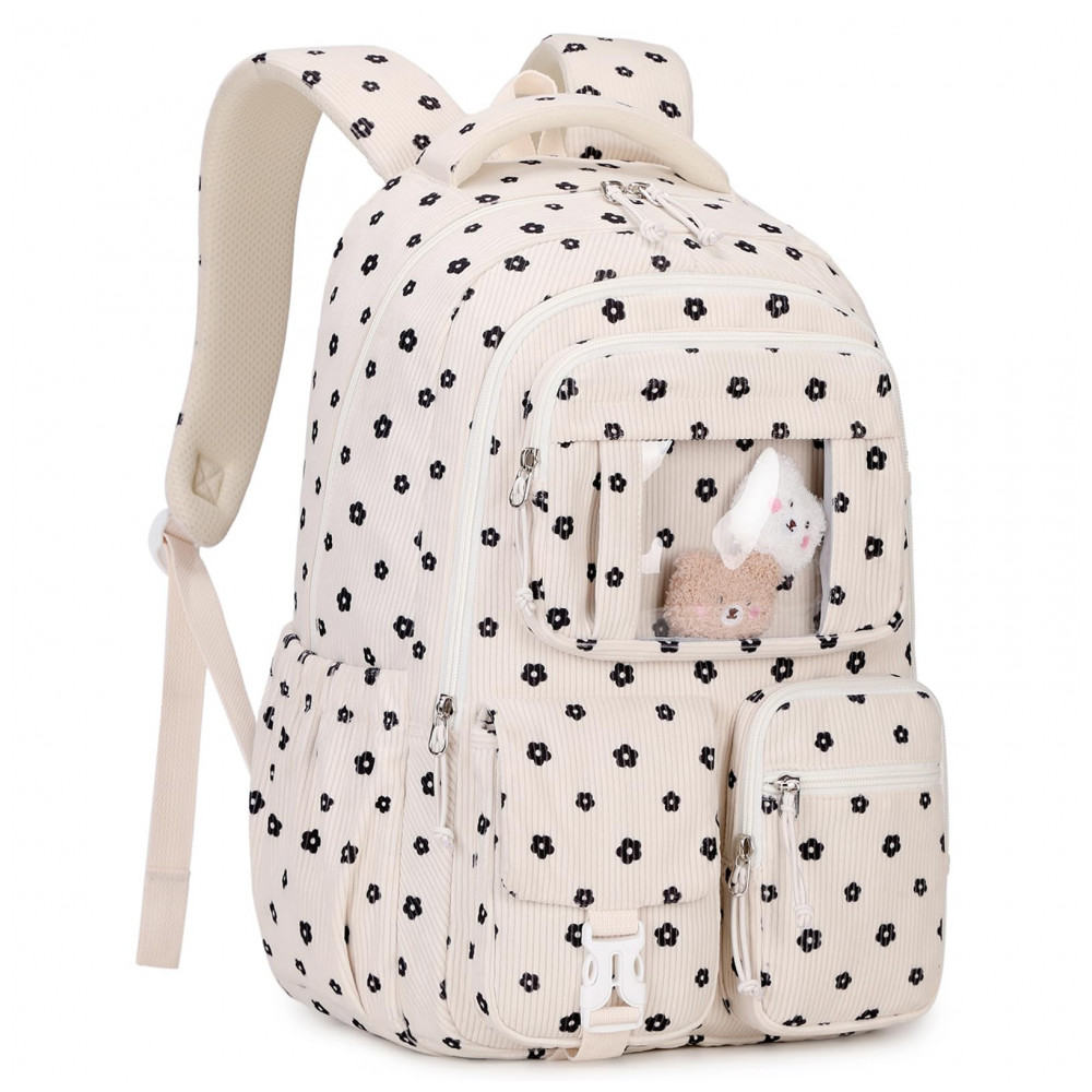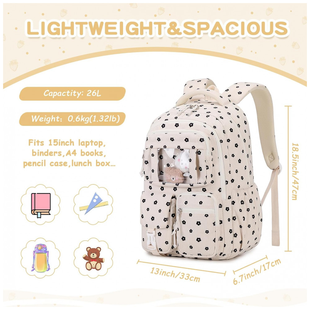 Na parte frontal, o bolso transparente em estilo ita bag permite exibir pins e acessórios, complementado por três bolsos menores para pequenos objetos de acesso rápido, além de bolsos laterais com elástico para garrafa de água e guarda-chuva. O corpo da mochila é confeccionado em veludo cotelê macio, leve e espesso, com costuras reforçadas e zíperes de abertura suave, adequado ao uso frequente em ambiente escolar e passeios. As alças acolchoadas com espuma espessa seguem desenho ergonômico para reduzir a pressão nos ombros, e o painel traseiro respirável contribui para maior conforto durante o uso contínuo.