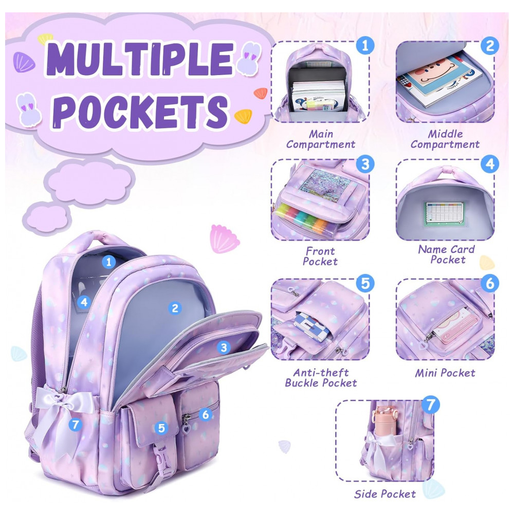 Mochila escolar infantil em tom roxo com tema de conchas e bolso frontal transparente em estilo ita bag, indicada para meninas de aproximadamente 6 a 14 anos em fase de ensino fundamental. Com cerca de 29 cm de largura, 16 cm de profundidade e 45 cm de altura, a mochila dispõe de compartimento principal com sleeve para notebook de até 15″, espaço para fichários A4, livros didáticos e lancheira, além de um segundo bolso frontal destinado a cadernos, estojo e materiais básicos.