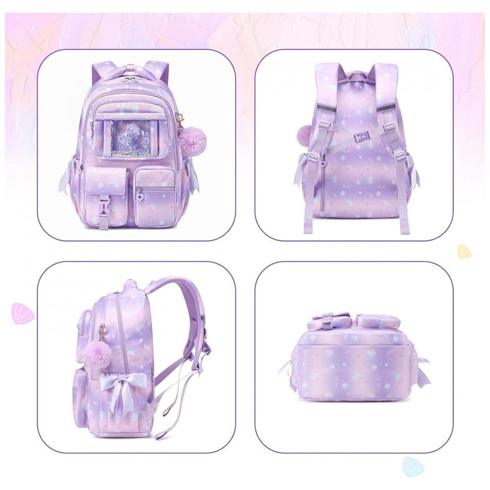 Na parte frontal, o bolso transparente superior permite exibir pins e pequenos acessórios, complementado por três bolsos menores para objetos de acesso rápido, enquanto os bolsos laterais com elástico acomodam garrafa de água e guarda-chuva compacto. A estrutura é produzida em poliéster espesso resistente à água e rasgos, com costuras reforçadas e zíperes de abertura suave, adequada ao uso frequente em ambiente escolar, passeios e viagens curtas. As alças de ombro acolchoadas com espuma e o painel traseiro respirável seguem desenho ergonômico para melhor distribuição do peso, contando ainda com faixa refletiva que auxilia na visibilidade em condições de baixa luminosidade.