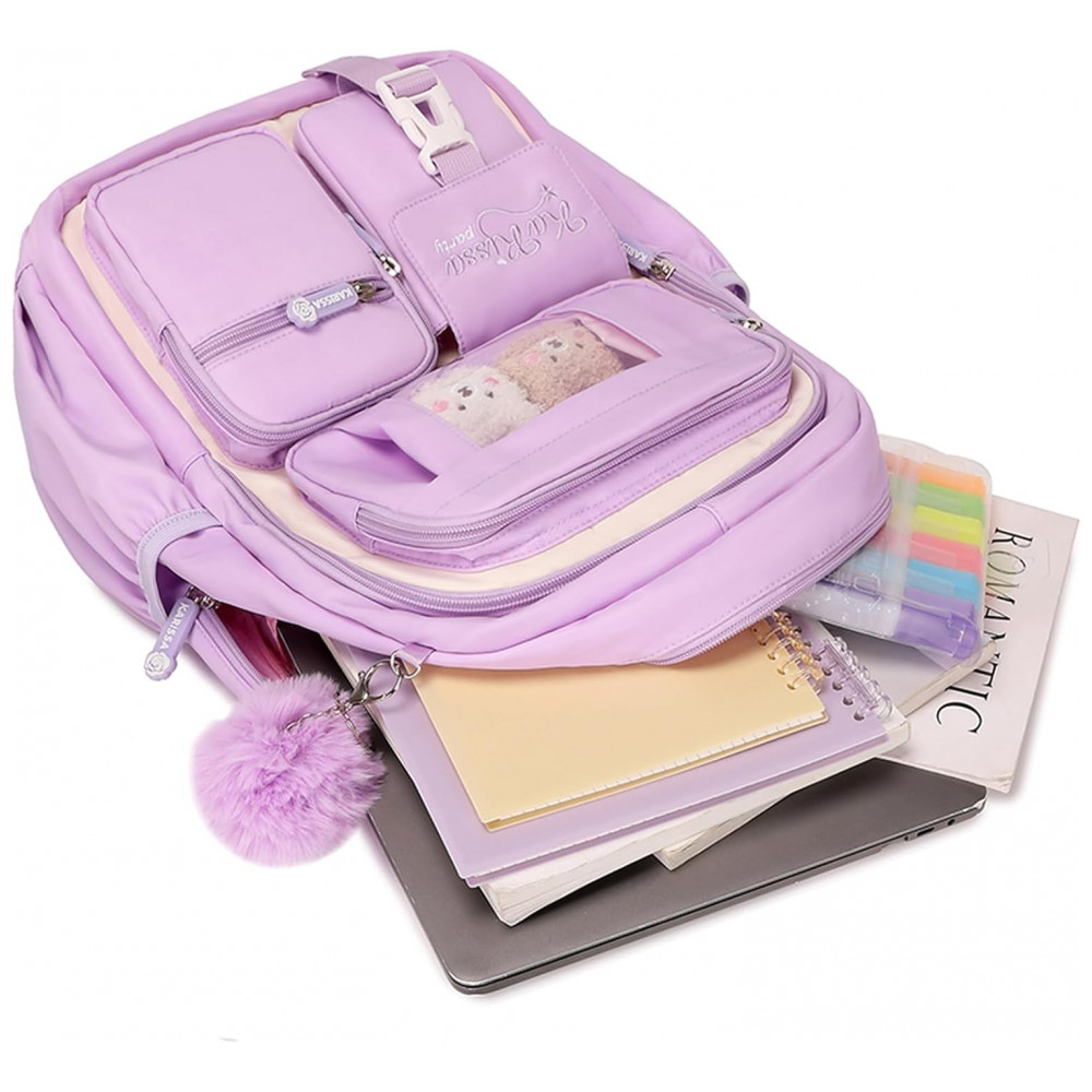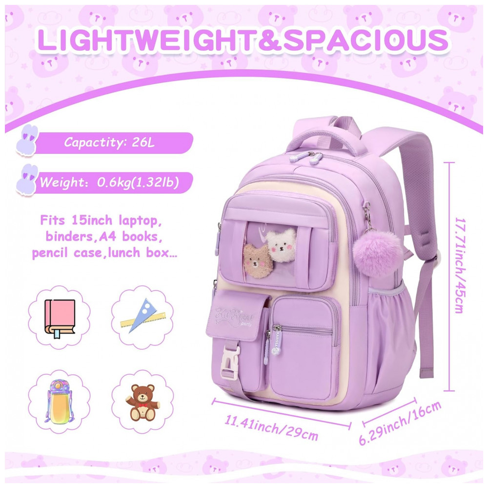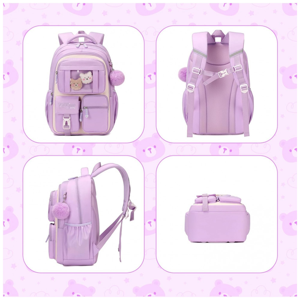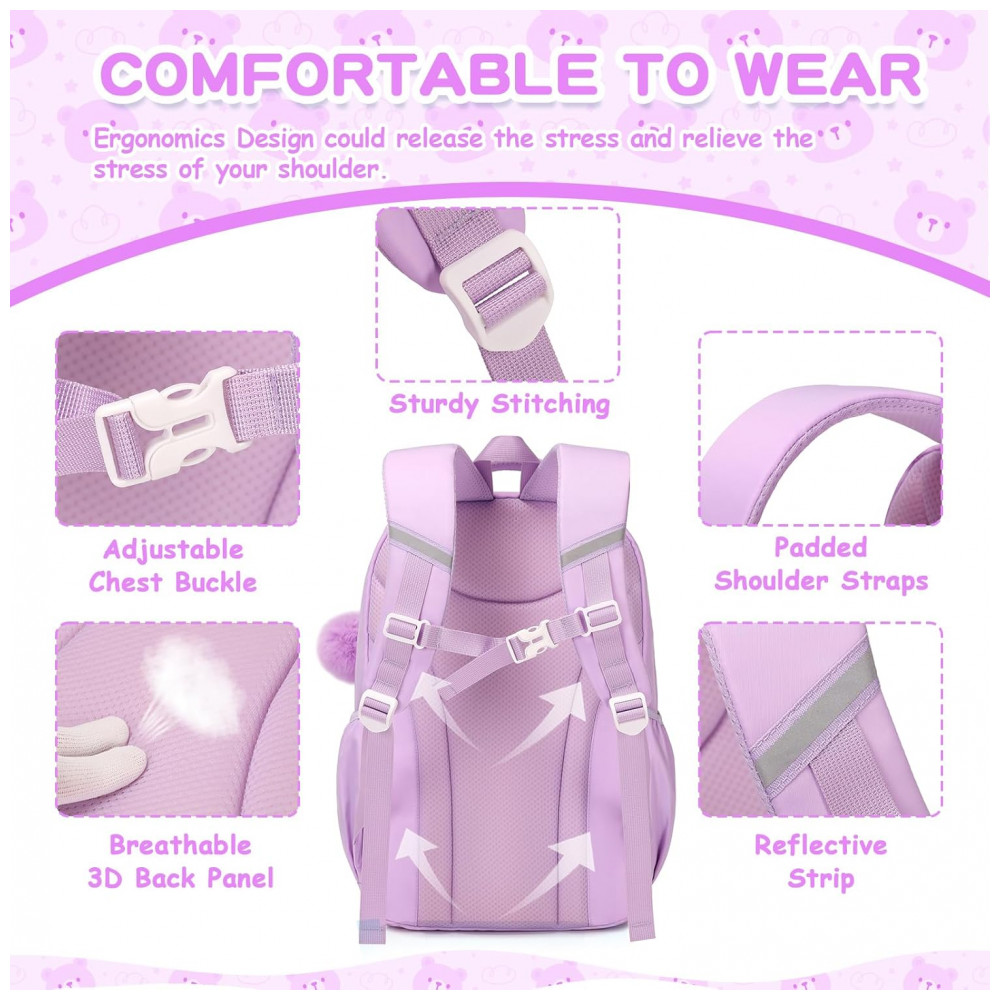 Na parte frontal, o bolso transparente superior permite exibir pins e pequenos acessórios, acompanhado de três bolsos menores para objetos de acesso rápido, enquanto os bolsos laterais com elástico comportam garrafas de água e guarda-chuva compacto. A estrutura é produzida em poliéster espesso resistente à água e rasgos, com costuras reforçadas e zíperes de abertura suave, adequada ao uso frequente em ambiente escolar, passeios e viagens curtas. As alças de ombro acolchoadas com espuma e o painel traseiro respirável seguem desenho ergonômico para melhor distribuição do peso, contando ainda com faixa refletiva que auxilia na visibilidade em condições de baixa luminosidade.