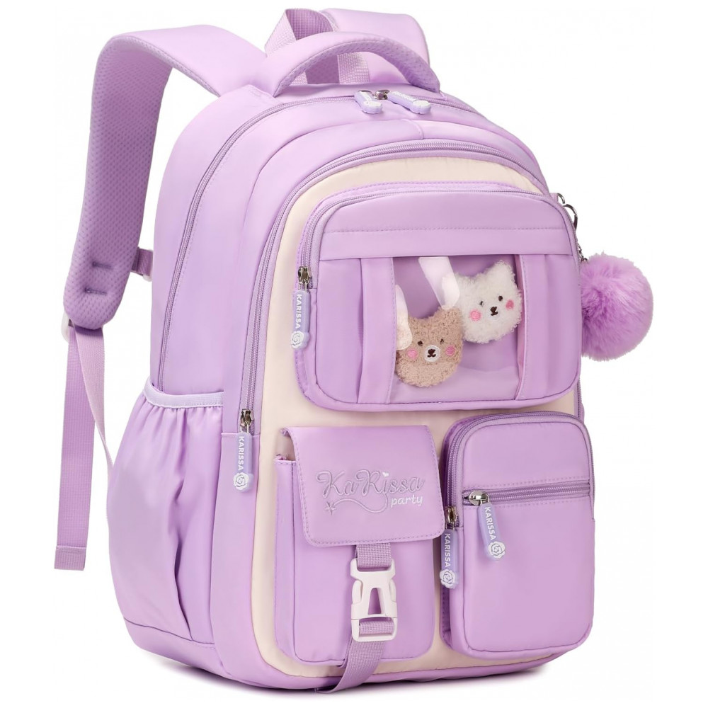 Mochila escolar infantil em tons de roxo e bege, com bolso frontal transparente em estilo ita bag, indicada para meninas de aproximadamente 6 a 14 anos em fase de ensino fundamental. Com cerca de 29 cm de largura, 16 cm de profundidade e 45 cm de altura, a mochila dispõe de compartimento principal com sleeve para notebook de até 15″, espaço para fichários A4, livros didáticos e lancheira, além de um segundo bolso frontal voltado para cadernos, estojo e materiais de uso diário.