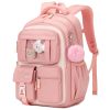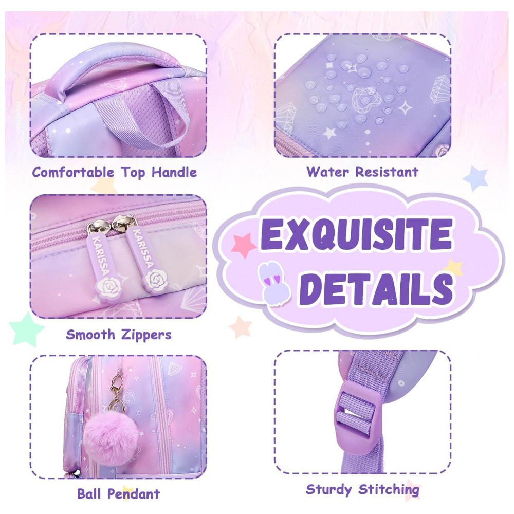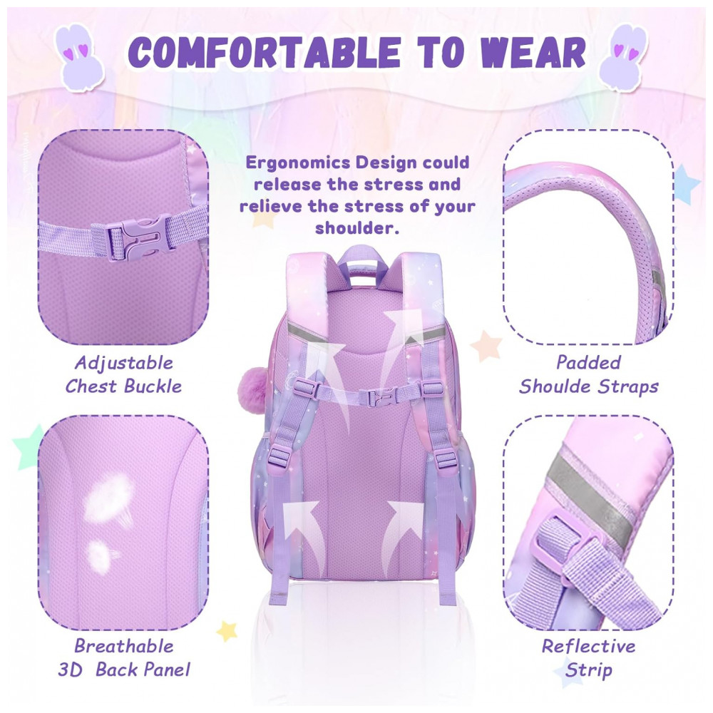 A parte frontal incorpora bolso transparente superior para exibição de acessórios decorativos e três bolsos menores para itens de acesso rápido, enquanto os bolsos laterais com elástico acomodam garrafas de água e guarda-chuva compacto. A estrutura é produzida em poliéster espesso resistente à água e rasgos, com costuras reforçadas e zíperes de abertura suave, adequada ao uso frequente em ambiente escolar, passeios e viagens curtas. As alças de ombro acolchoadas com espuma e o painel traseiro respirável seguem desenho ergonômico para melhor distribuição do peso, contando ainda com faixa refletiva que auxilia na visibilidade em condições de baixa luminosidade.