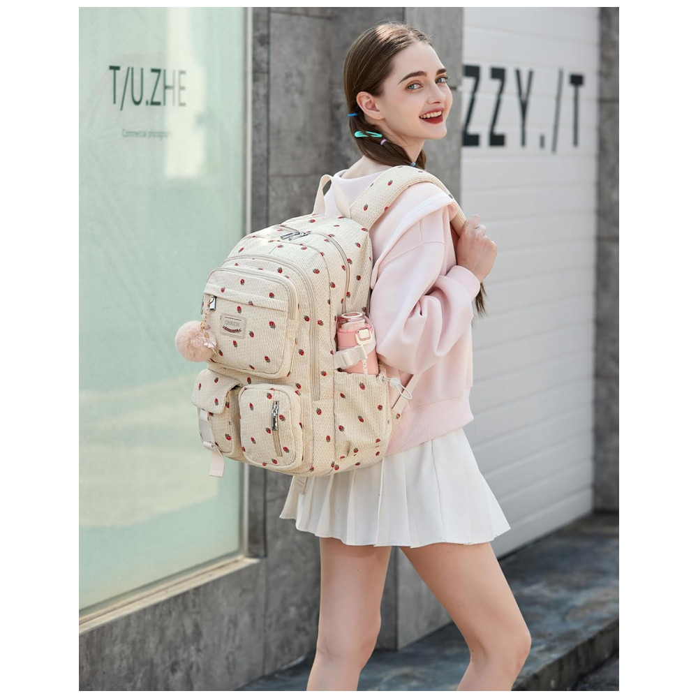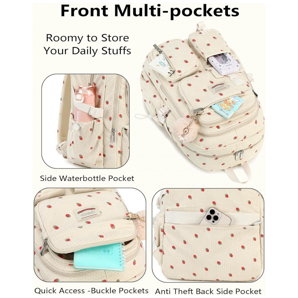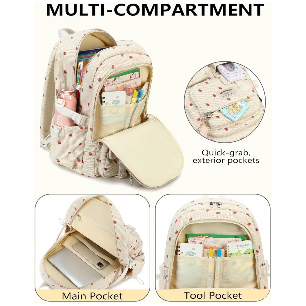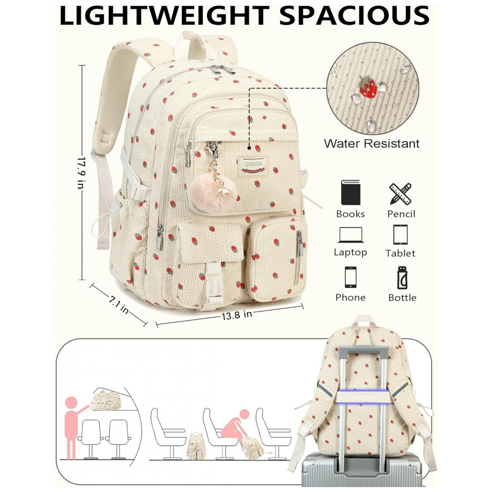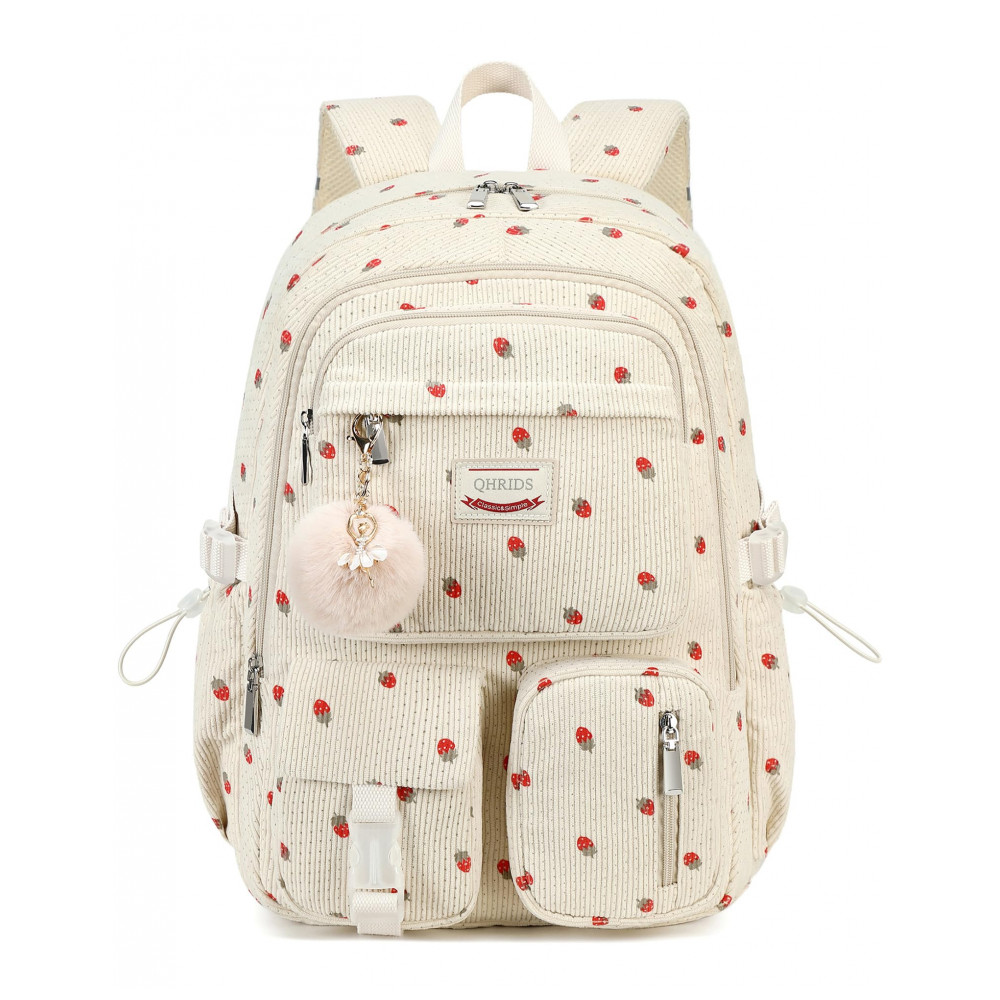 Mochila escolar QHRIDS corduroy bege com estampa de morangos para notebook 38 cm grande capacidade com bolso antirroubo