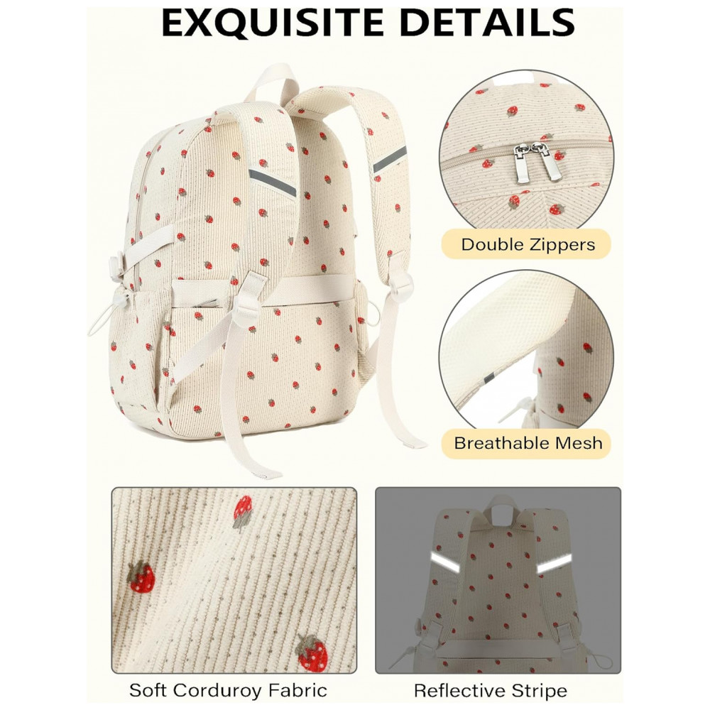 Conteúdo da caixa: 1 mochila QHRIDS corduroy bege com estampa de morangos