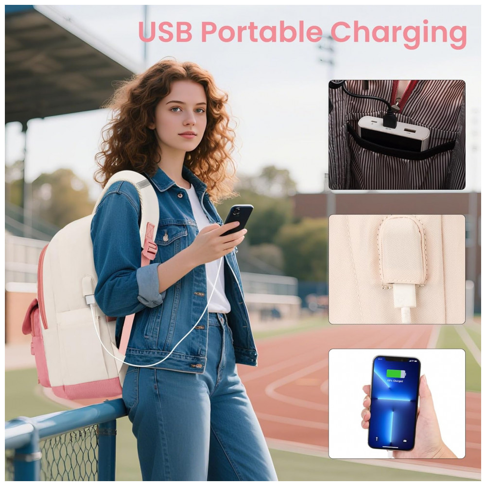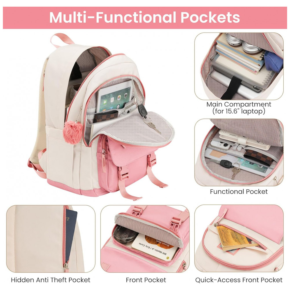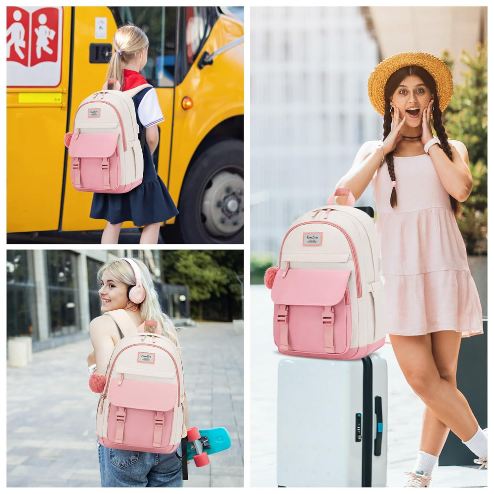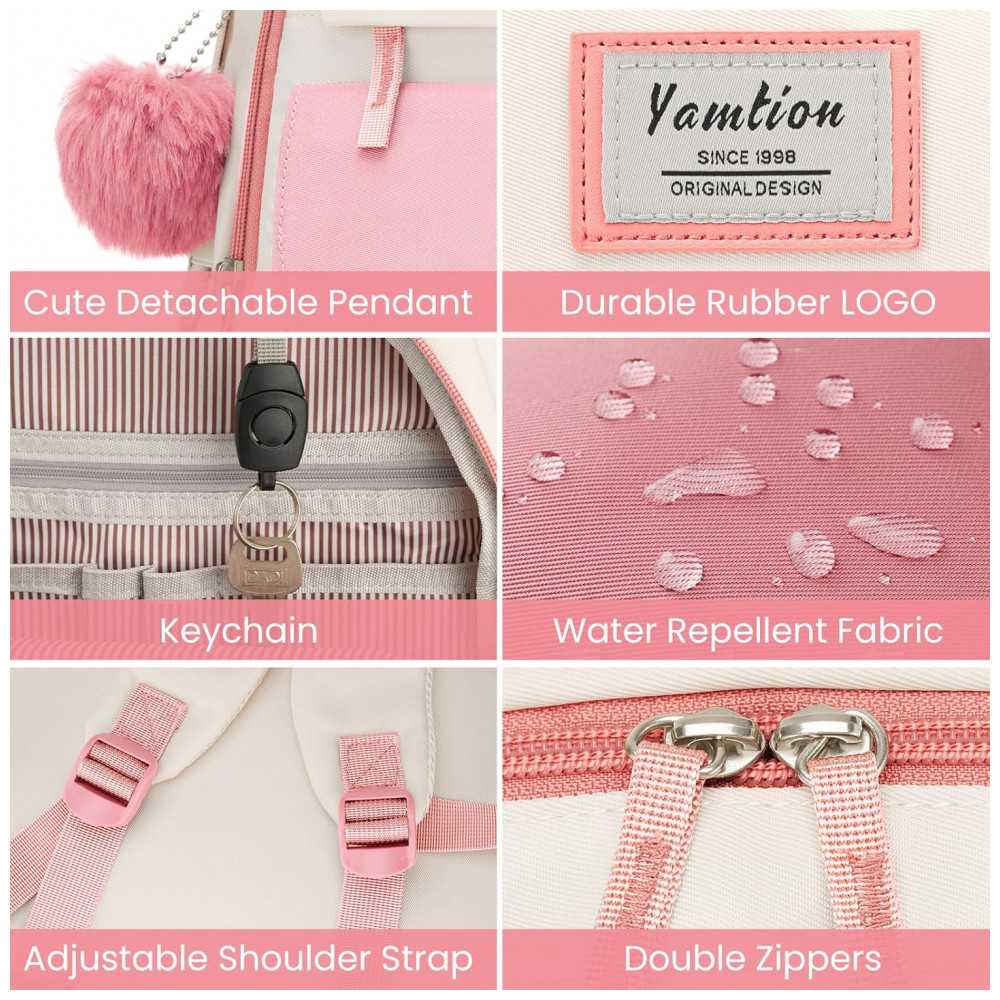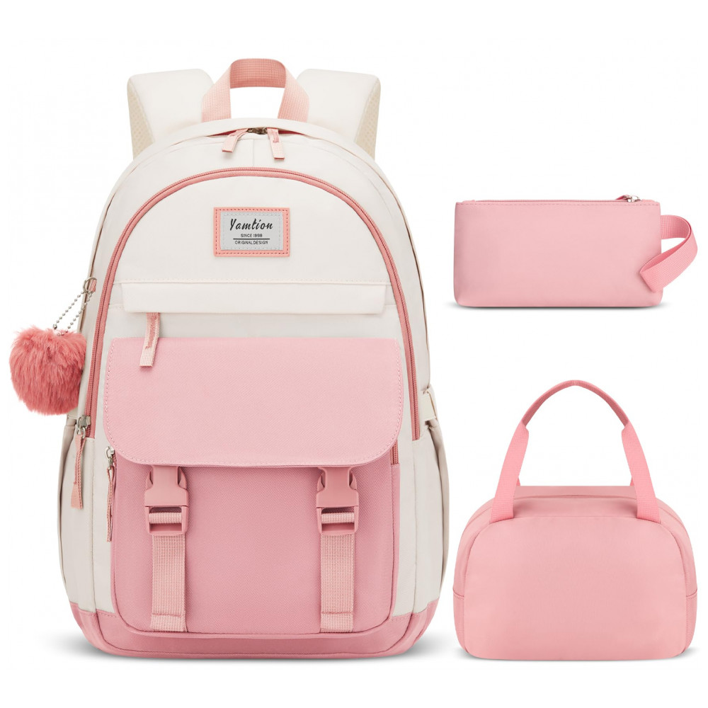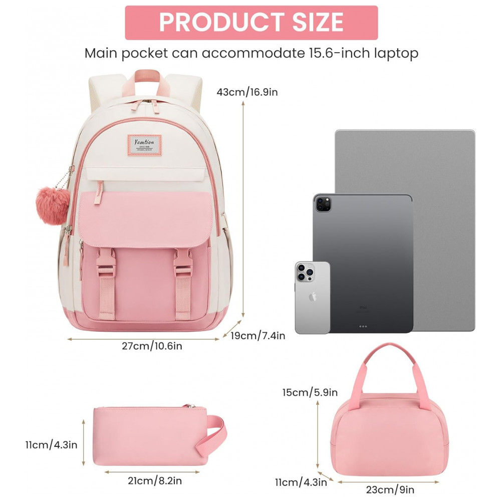 Mochila escolar YAMTION em conjunto de 3 peças, composta por mochila com compartimento acolchoado para notebook de até 39,6 cm, lancheira e estojo, indicada para adolescentes e mulheres em escola, faculdade, trabalho e uso diário. A organização interna com 5 compartimentos separados, divisórias para materiais de estudo, bolsos frontais e bolsos laterais em tela permite acomodar cadernos, livros, tablet, acessórios eletrônicos, garrafas e itens pessoais de forma prática.