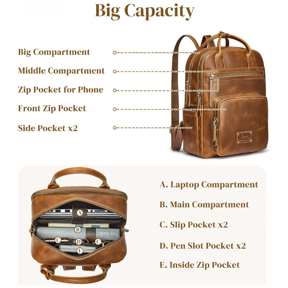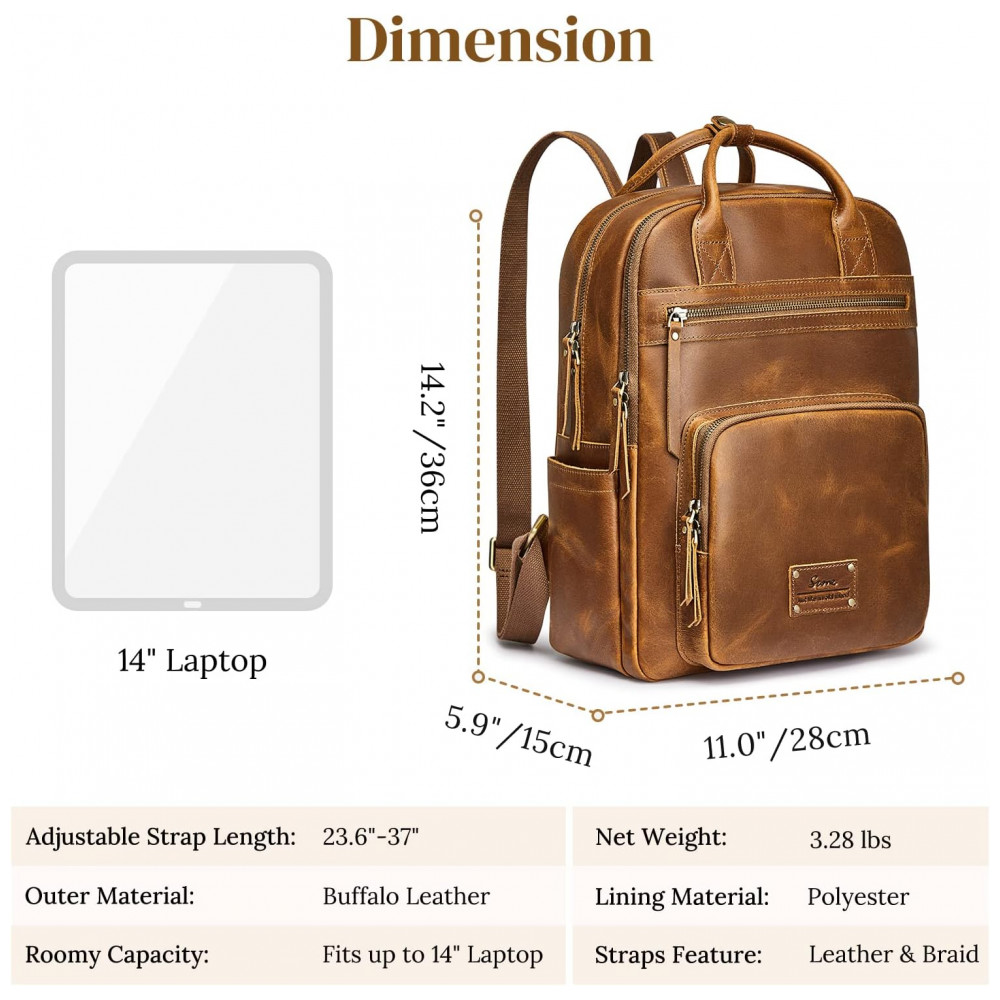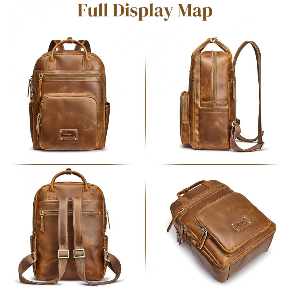 COURO COMPLETOEsta mochila é totalmente feita de couro de cavalo louco incluindo a parte traseira, os arranhões desordenados naturais mostram mais retrô e rústico. E nós engrossamos o couro para reforçar toda a bolsa para maior durabilidade, então esta mochila de couro seria um pouco mais pesada 1,49 kg do que uma bolsa de náilon ou lona.