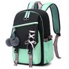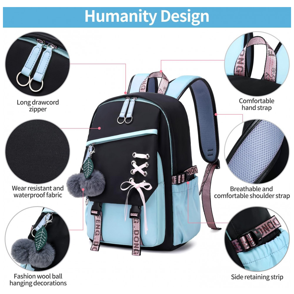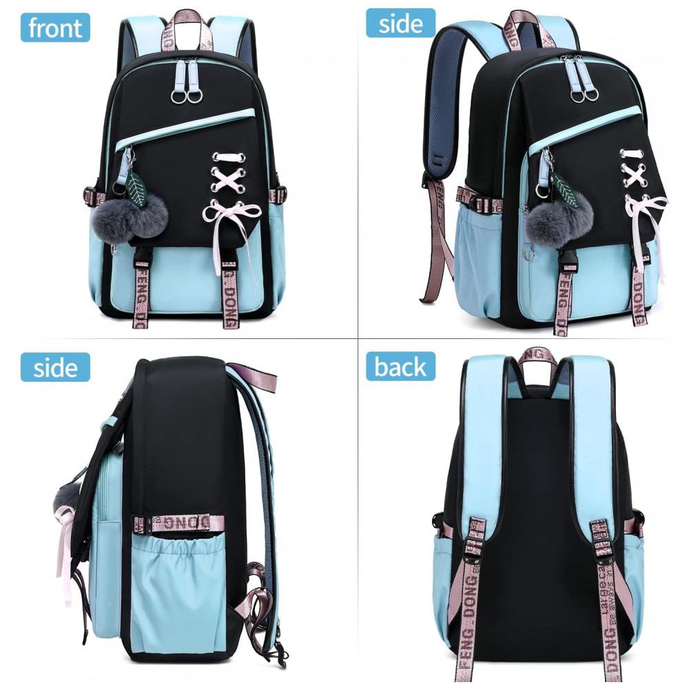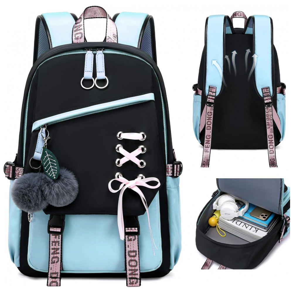 Mochila FENGDONG azul para adolescentes estilo kawaii com laço e pompom para notebook até 156″