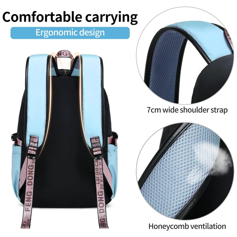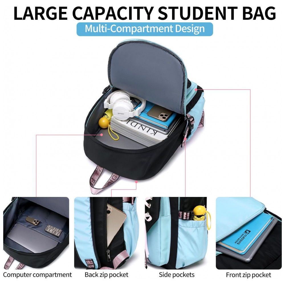 O design ergonômico conta com alças ajustáveis acolchoadas que ajudam a aliviar a pressão nos ombros e costas, além de painel traseiro com material respirável para maior conforto em uso prolongado. O tecido é resistente à água e ao desgaste, adequado ao uso frequente, com visual em estilo anime/kawaii, laços decorativos e pompom de pelúcia que deixam a mochila mais divertida para uso escolar e urbano.