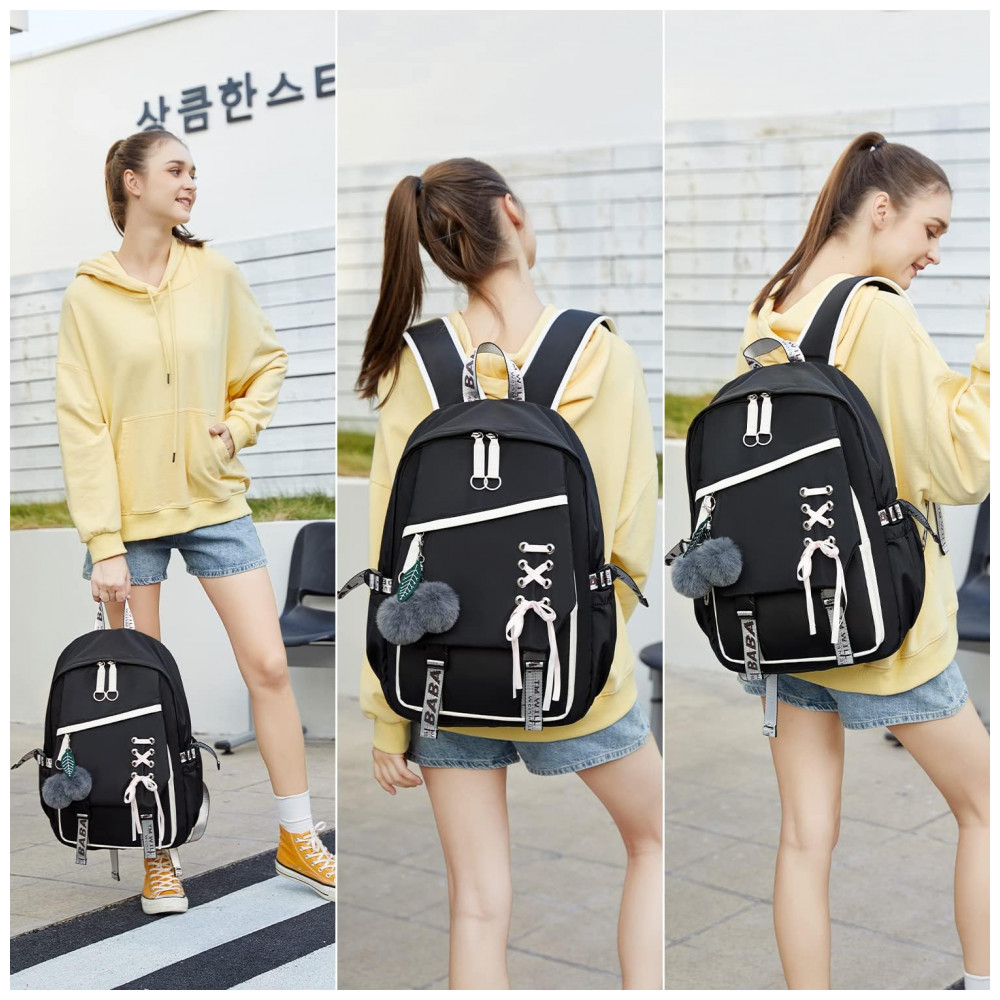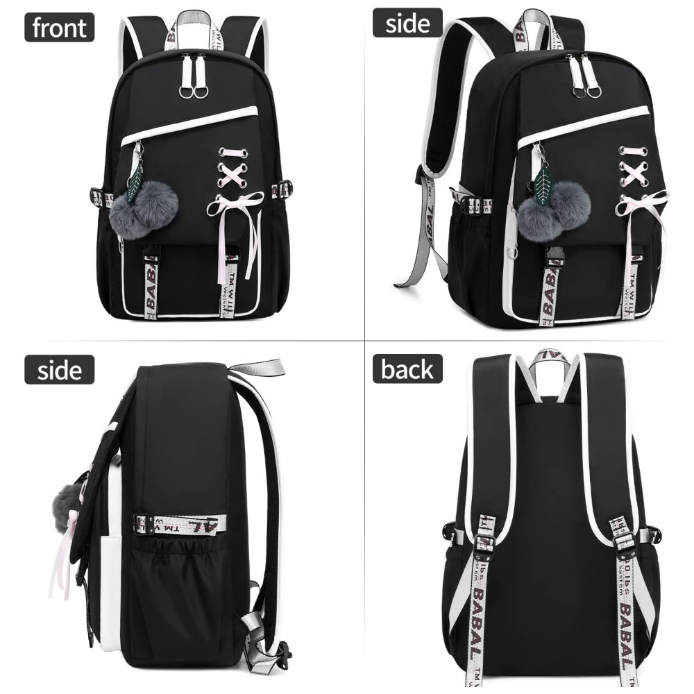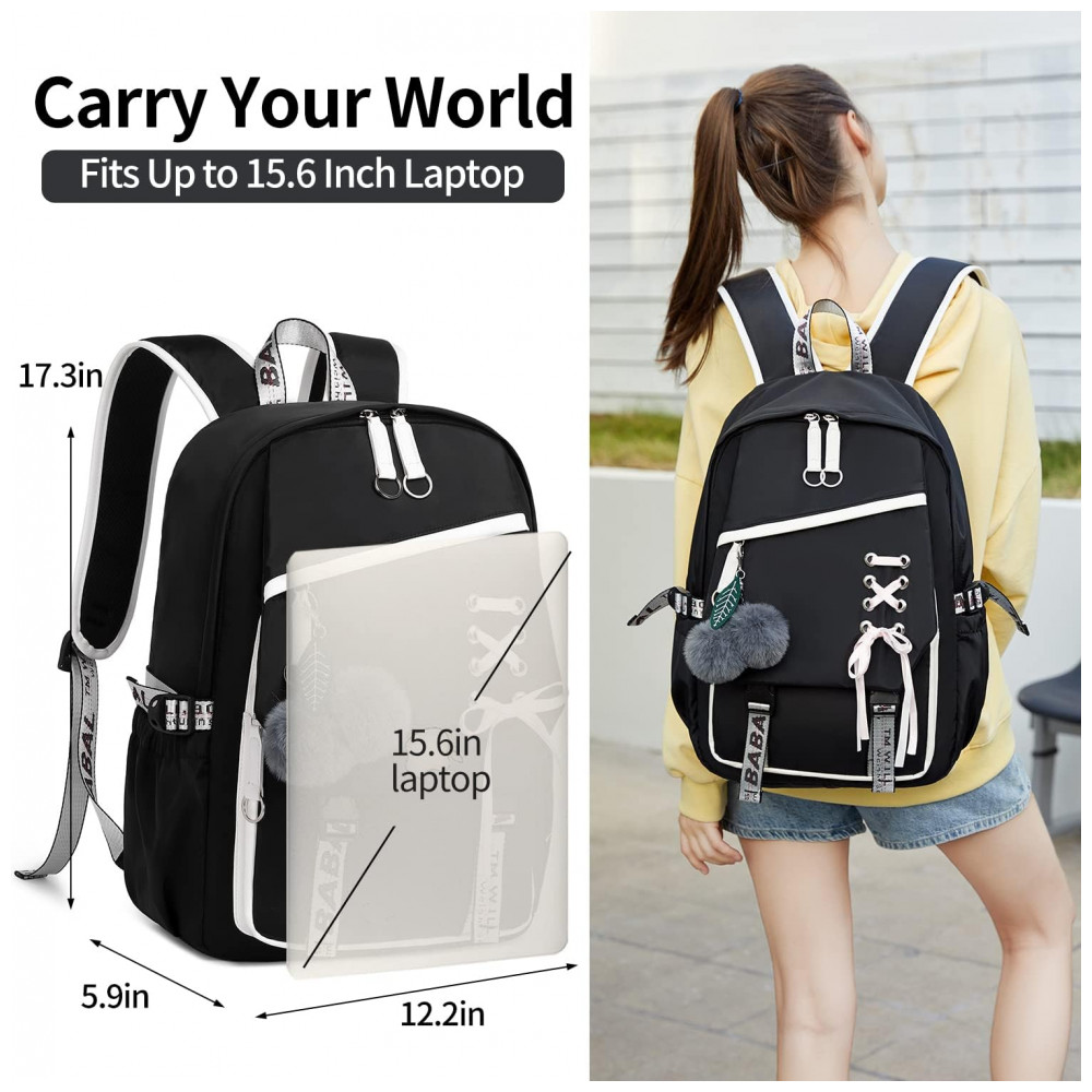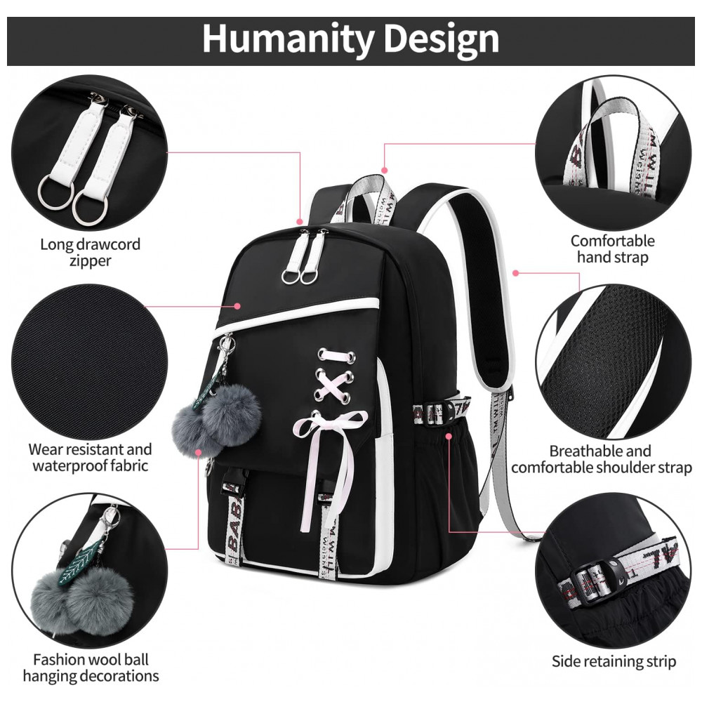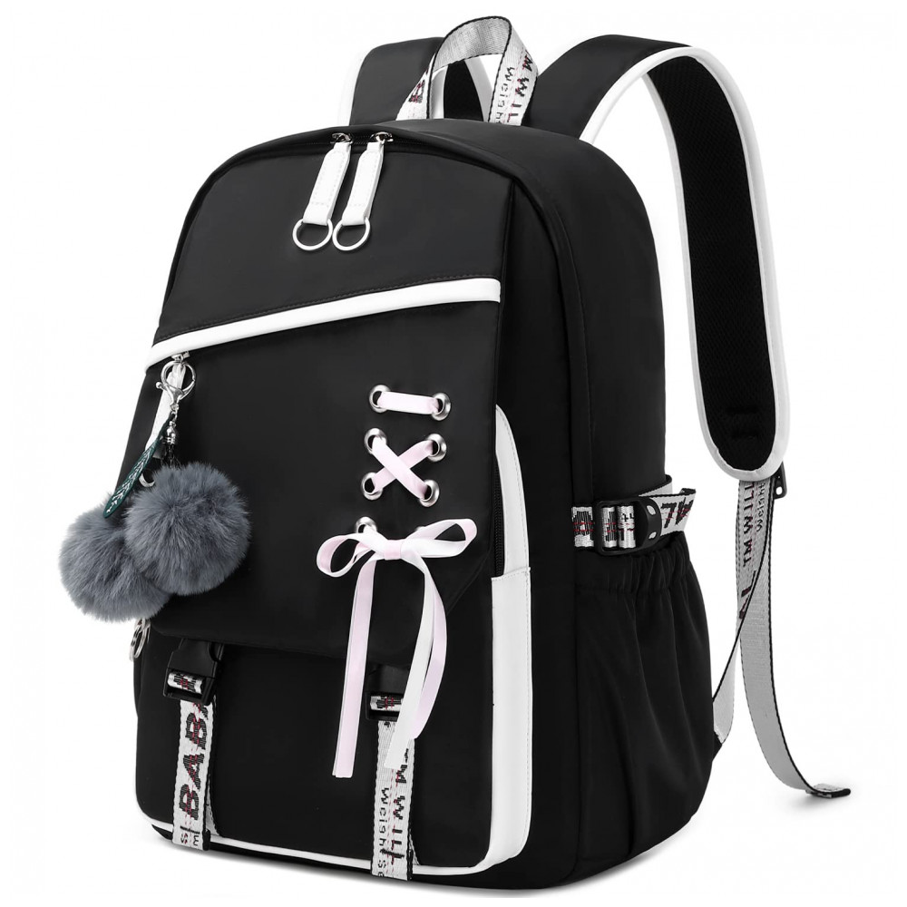 Mochila FENGDONG preta para adolescentes estilo kawaii com laço e pompom para notebook até 156″
