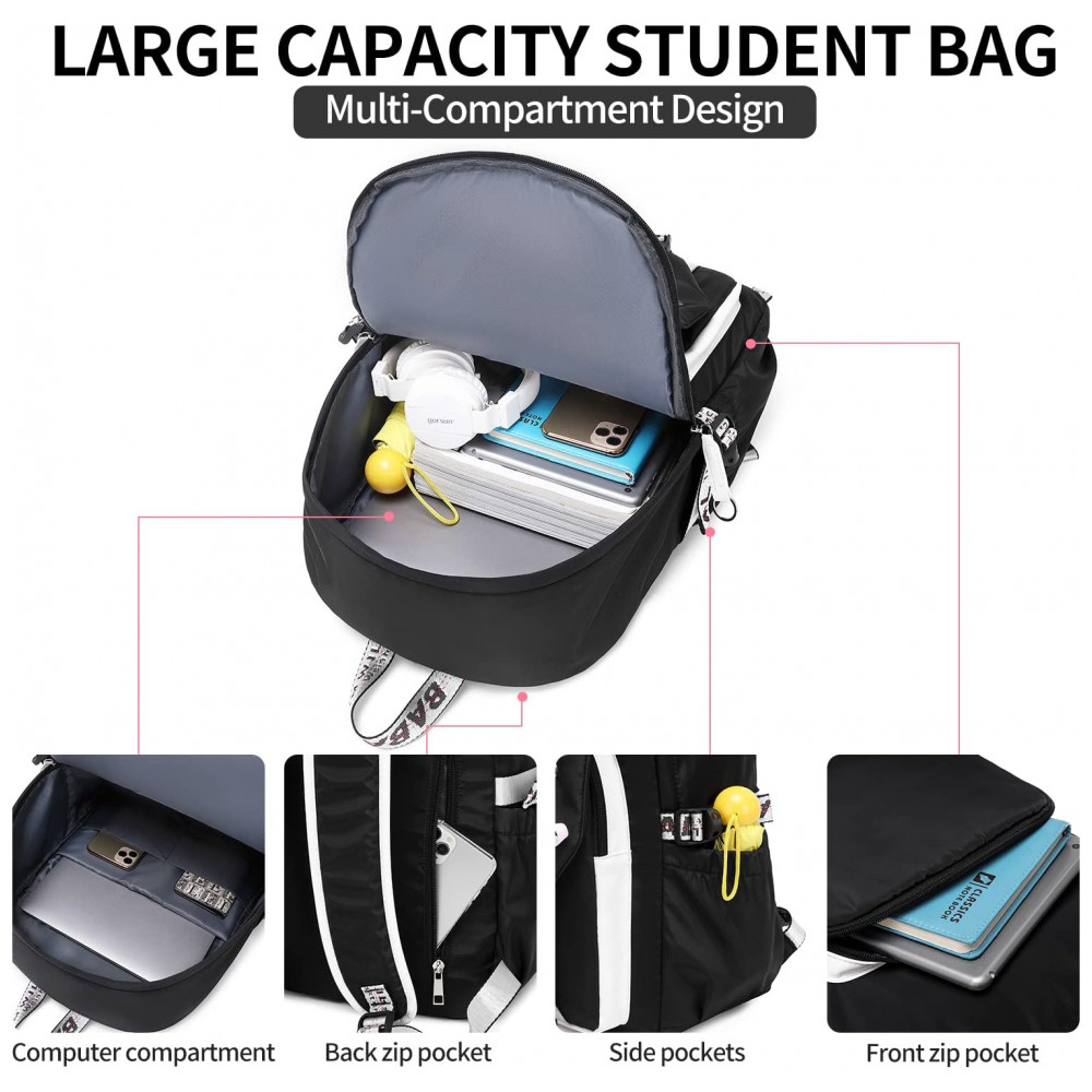 O design ergonômico conta com alças ajustáveis acolchoadas que ajudam a aliviar a pressão nos ombros e costas, além de painel traseiro com material respirável para maior conforto em uso prolongado. O tecido é resistente à água e ao desgaste, adequado ao uso frequente, com visual em estilo anime/kawaii, laços decorativos e pompom de pelúcia que deixam a mochila mais divertida para uso escolar e urbano.