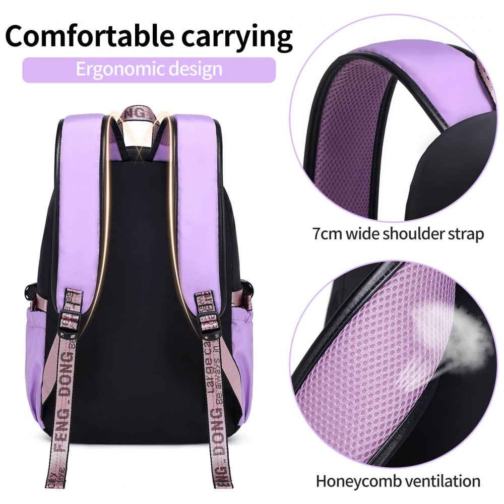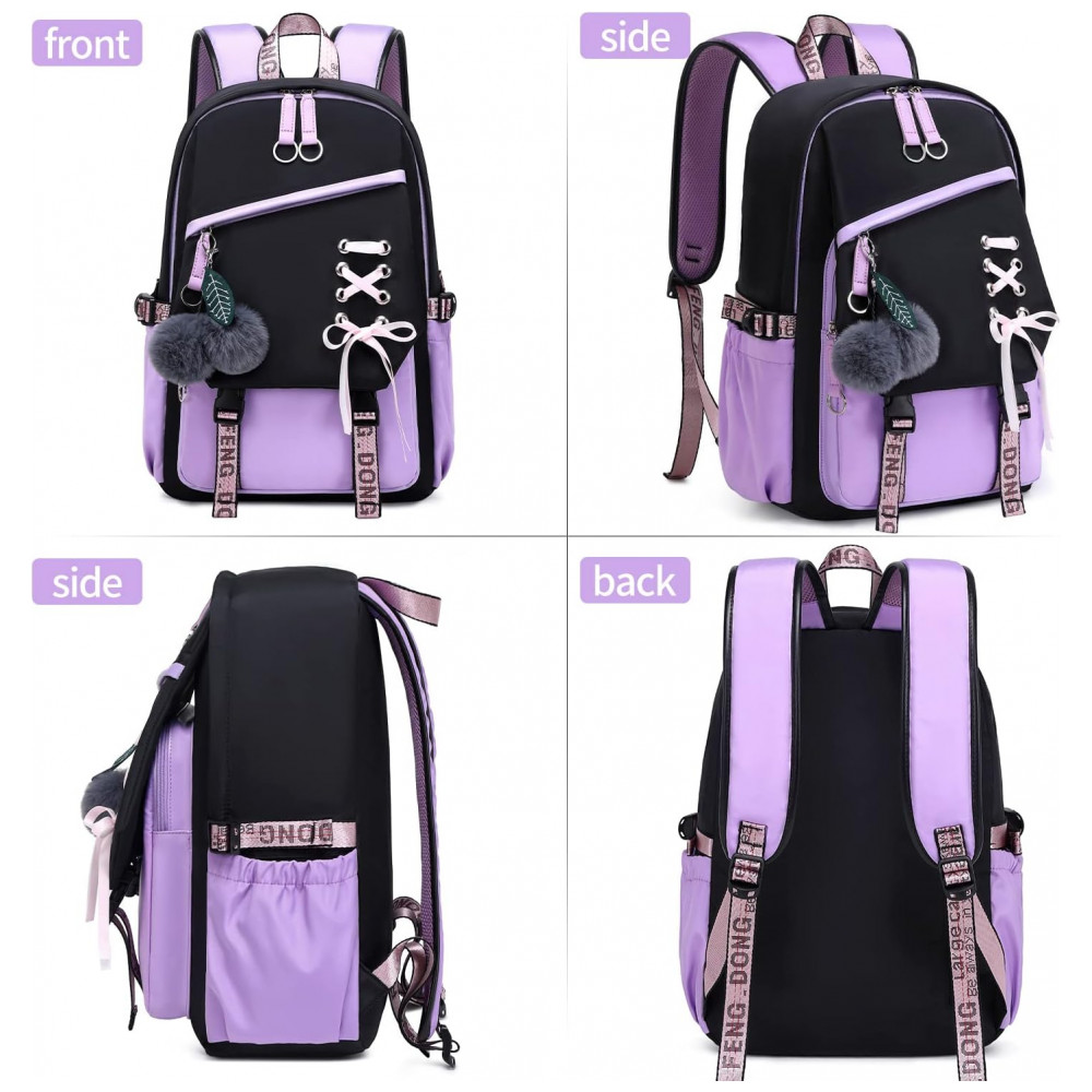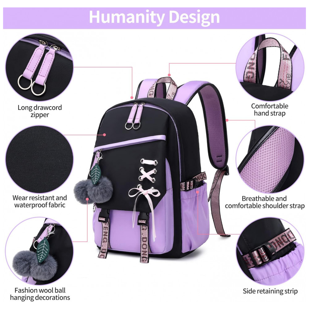Mochila FENGDONG roxa para adolescentes estilo kawaii com laço e pompom para notebook até 156″