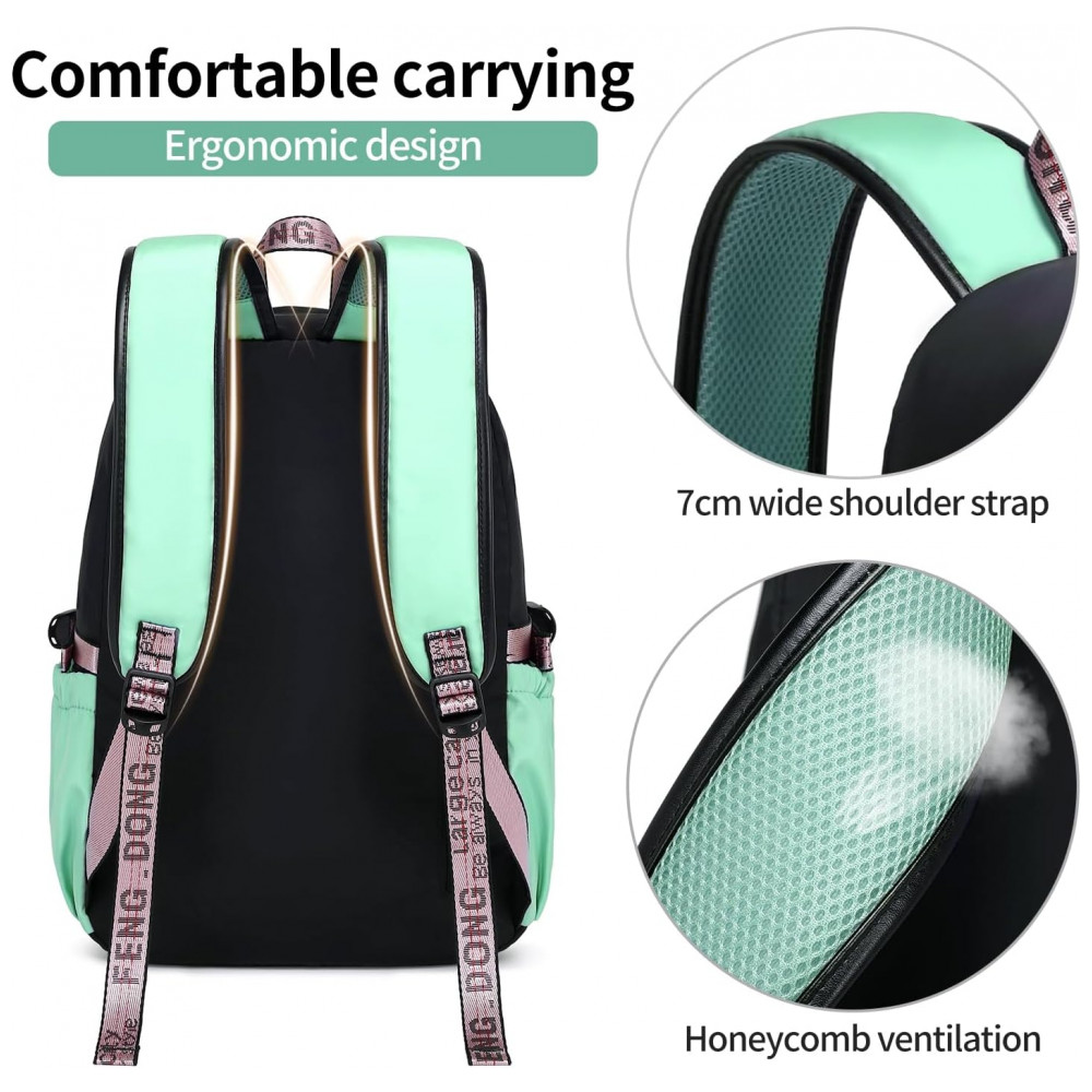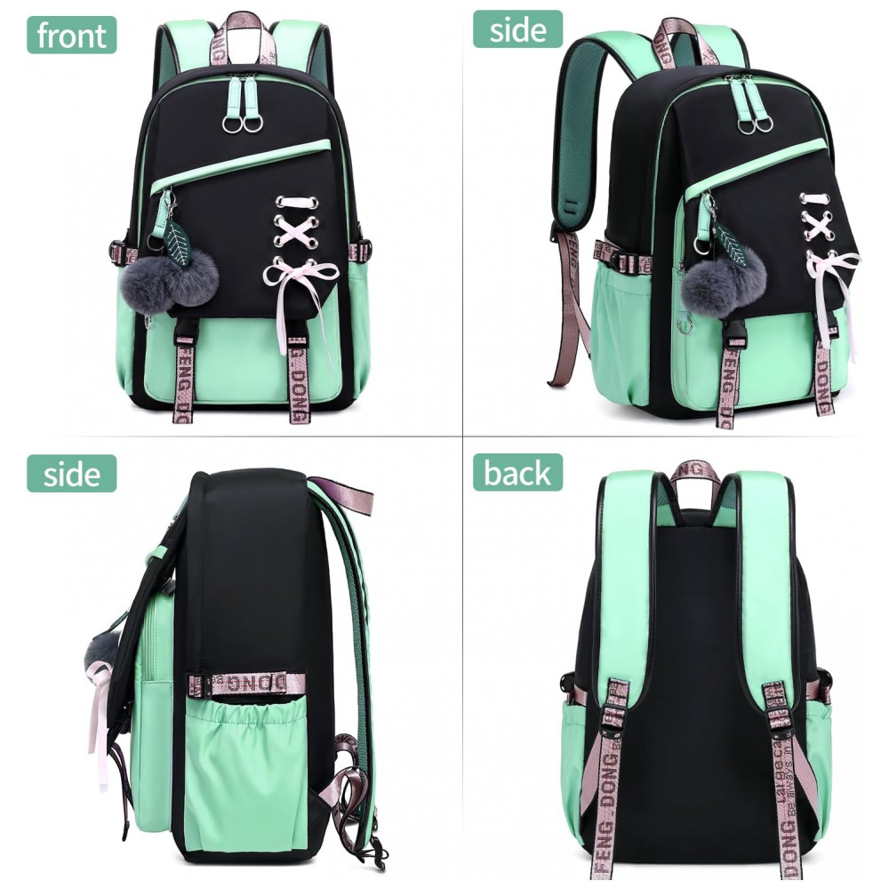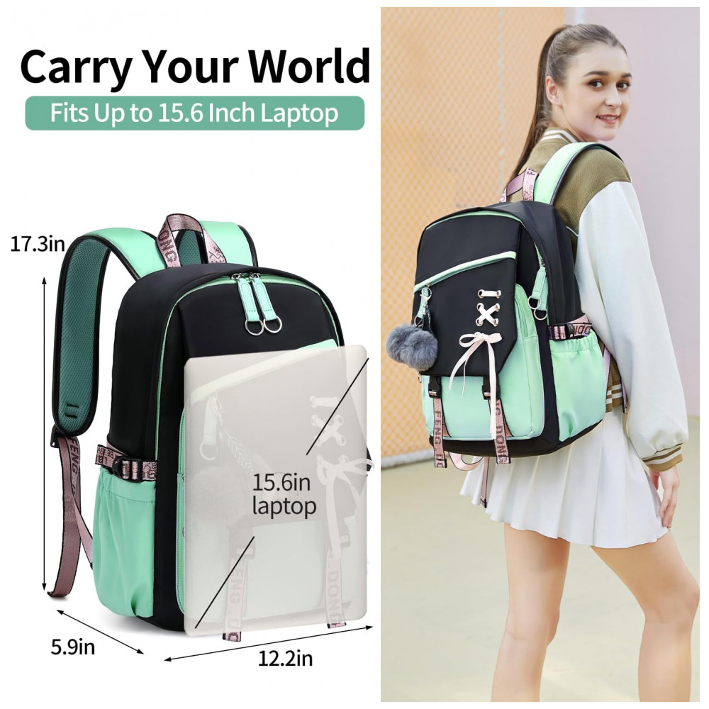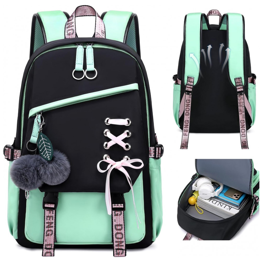 Mochila FENGDONG verde para adolescentes estilo kawaii com laço e pompom para notebook até 156″