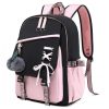 O design ergonômico conta com alças ajustáveis acolchoadas que ajudam a aliviar a pressão nos ombros e costas, além de painel traseiro com material respirável para maior conforto em uso prolongado. O tecido é resistente à água e ao desgaste, adequado ao uso frequente, com visual em estilo anime/kawaii, laços decorativos e pompom de pelúcia que deixam a mochila mais divertida para uso escolar e urbano.