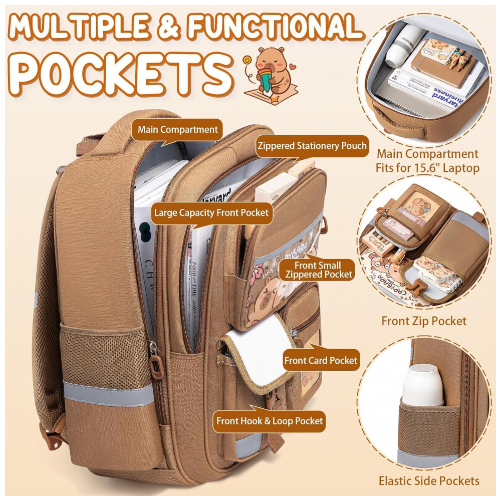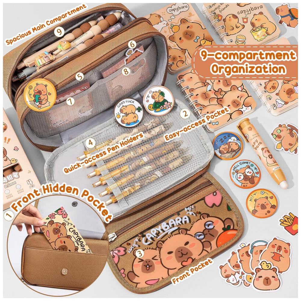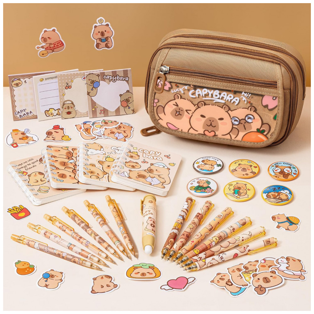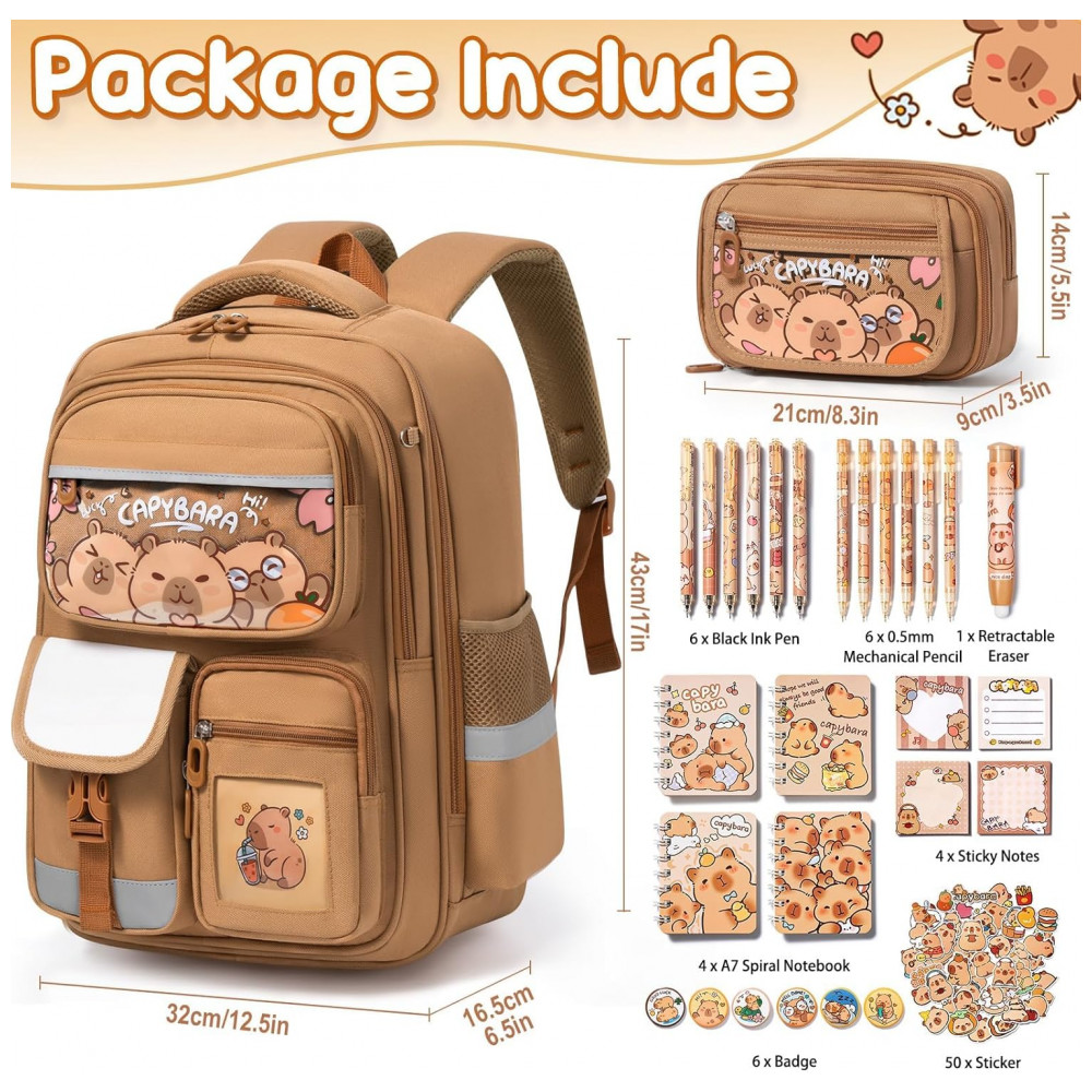 Modelo: Fimibuke Capybara Backpack for School Girls 28PCS Capybara Toddler School Supplies Stationery Set with Bookbag Pencil Case Pens Pencils Notebook