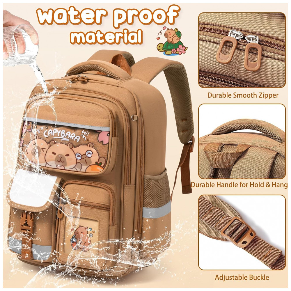 A mochila infantil Fimibuke com kit escolar capivara 28 peças é indicada para uso em escola, creche e atividades do dia a dia, sendo fabricada em material têxtil leve com revestimento em nylon de alta densidade e forro em poliéster, com compartimento principal para livros, cadernos e roupas leves, divisória acolchoada para dispositivos, três bolsos frontais com zíper para estojo e pequenos acessórios, dois bolsos laterais com elástico para garrafa ou guarda-chuva e alças reguláveis com tira peitoral e costas acolchoadas em tecido respirável para maior conforto em uso prolongado.