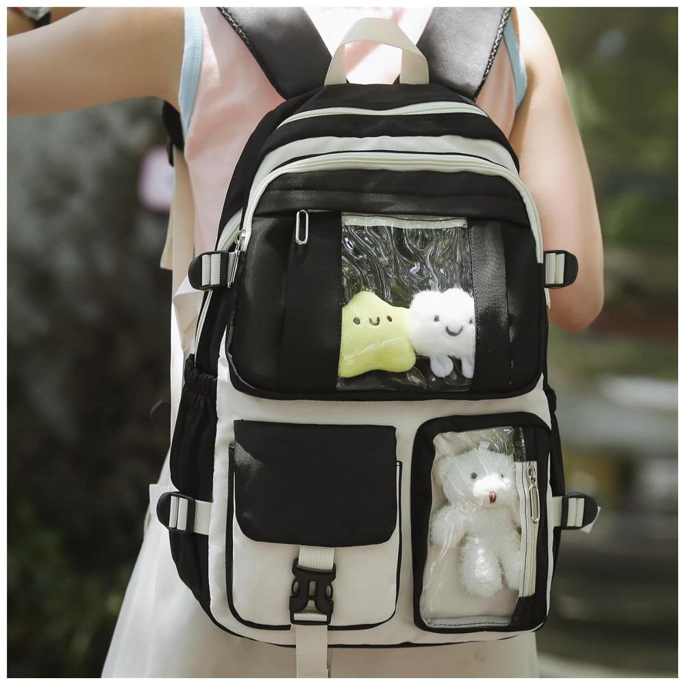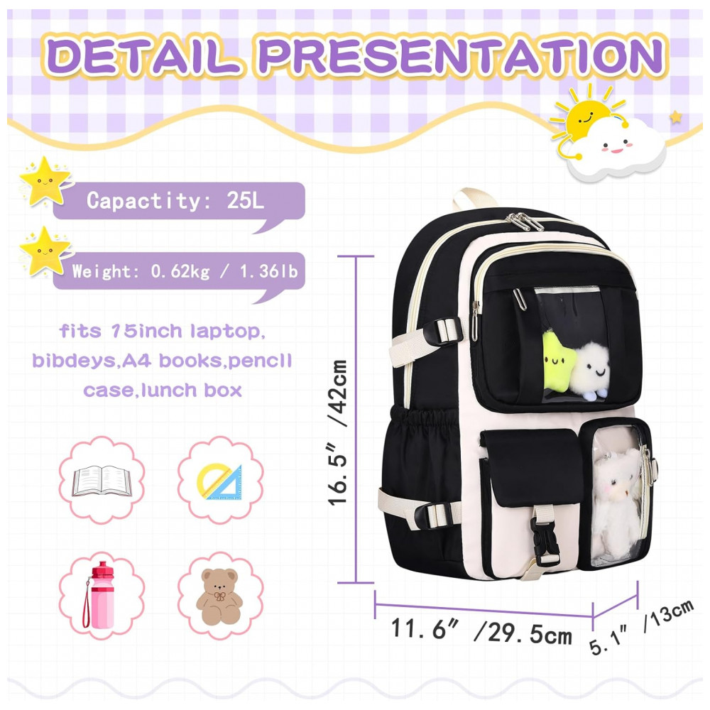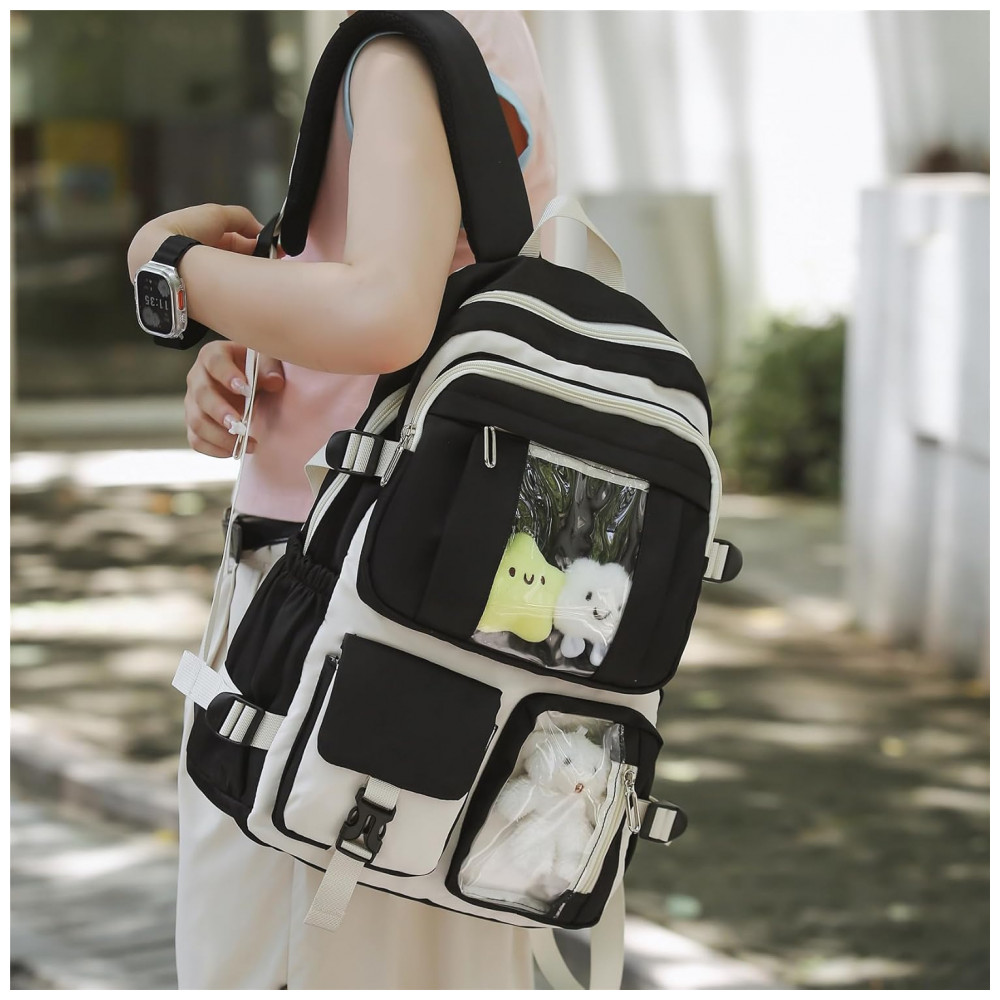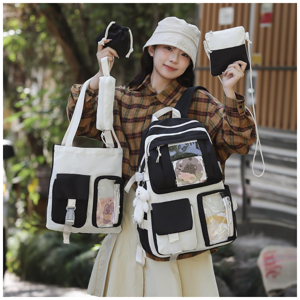 Conjunto escolar com cinco peças em estilo preppy kawaii, indicado para crianças e pré‑adolescentes em idade escolar, para uso em sala de aula, biblioteca, atividades de dança, passeios e pequenas viagens. O kit inclui mochila principal, bolsa tiracolo, pequena bolsa de mão, saquinho tipo saco com cordão e estojo, todos com visual em blocos de cor e bolsos frontais transparentes para exibir itens decorativos e acessórios.