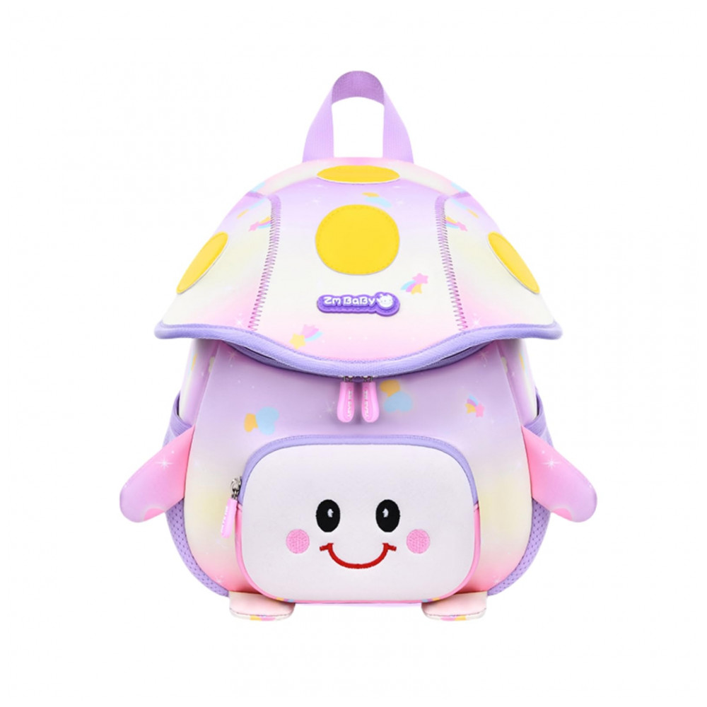 A mochila infantil Armbq roxa com guia de segurança é indicada para uso em escola, creche e passeios, com formato compacto e elementos gráficos inspirados em cogumelos, fabricada em tecido sintético impermeável e respirável, com compartimento principal para itens de uso diário, bolso frontal para pequenos objetos, dois bolsos laterais elásticos para garrafa ou guarda-chuva e alças ajustáveis acolchoadas com tira peitoral, além de costas com acolchoamento em espuma para maior conforto no transporte infantil.