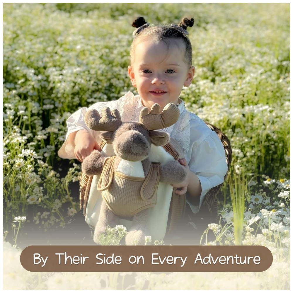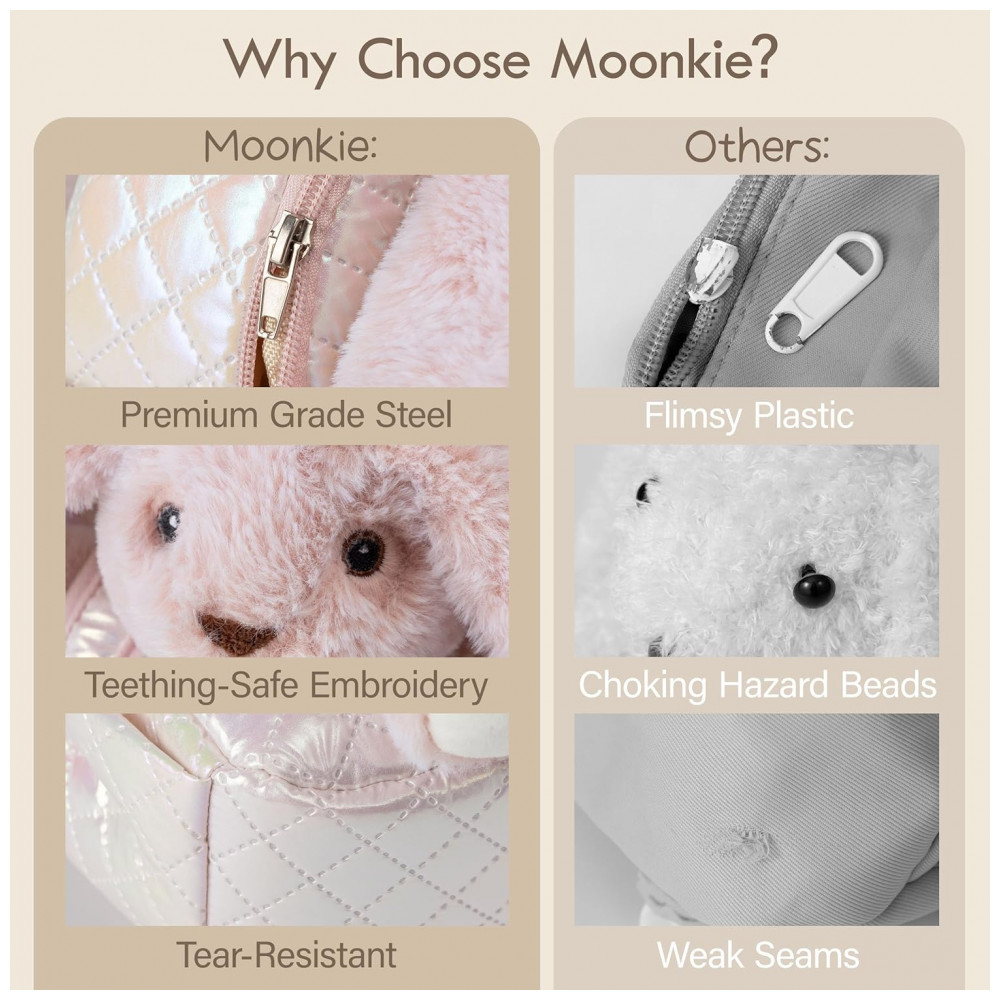 Mochila infantil Moonkie Hug & Go em formato de coelho, desenvolvida em pelúcia macia com pelúcia destacável frontal, indicada para crianças pequenas em fase de berçário, pré-escola e passeios. O conjunto foi projetado para que a criança carregue pequenos pertences e tenha ao mesmo tempo um brinquedo de pelúcia integrado para conforto e brincadeiras.
