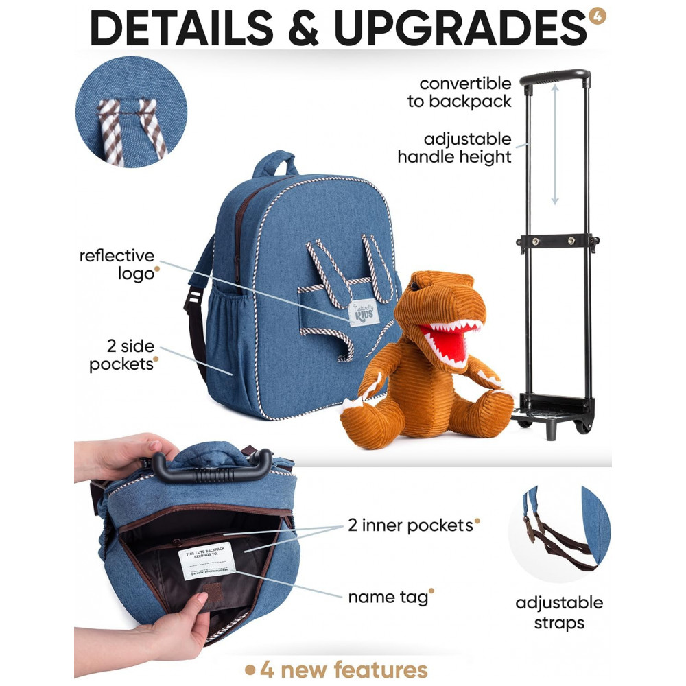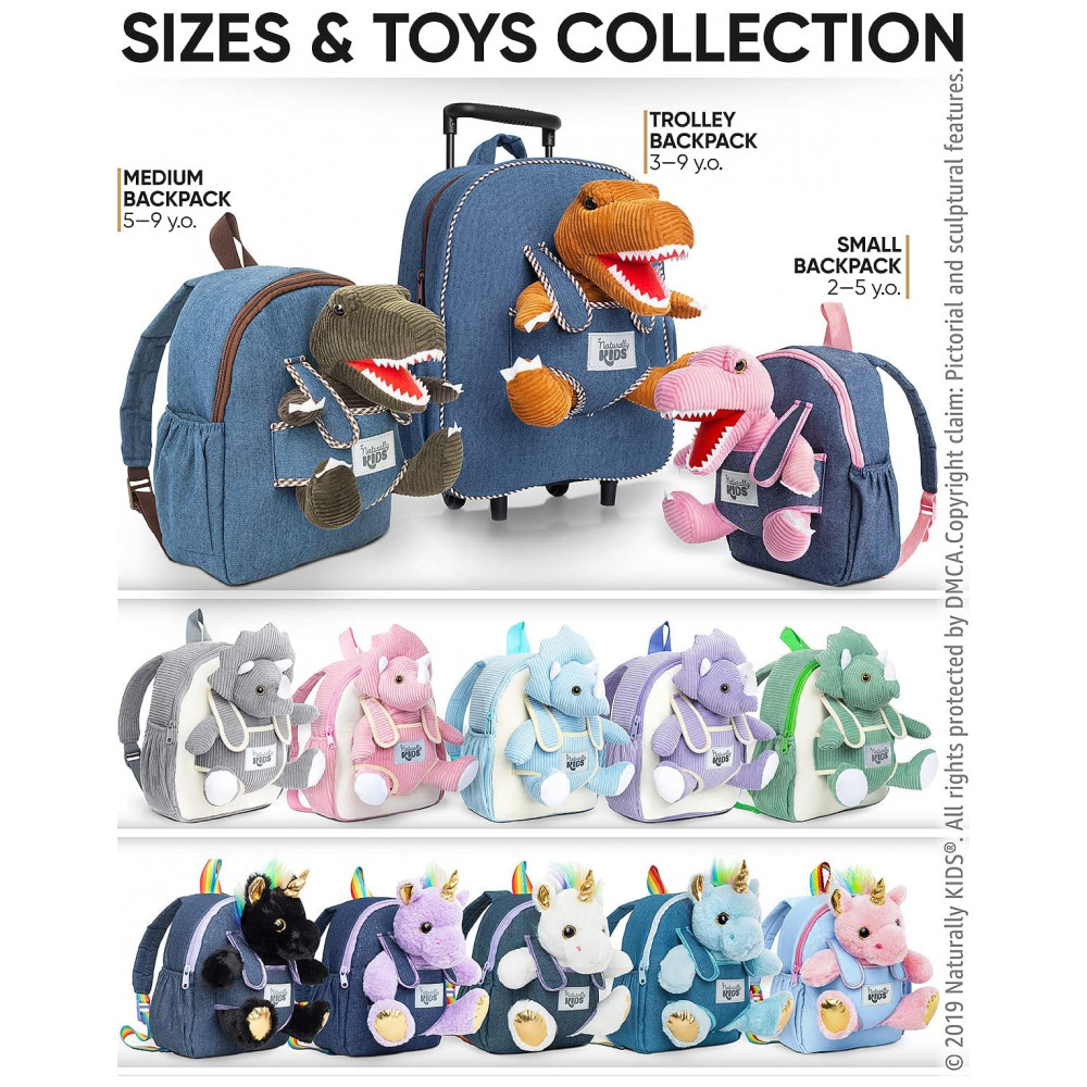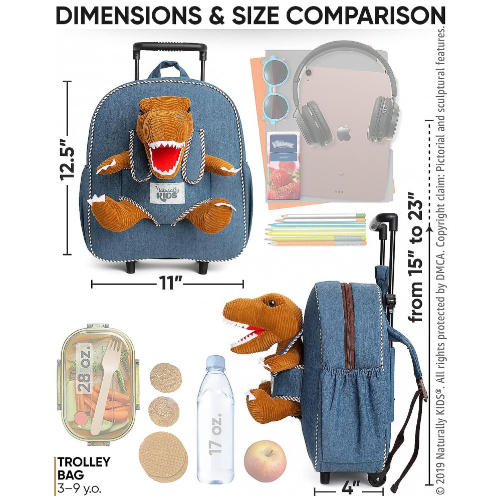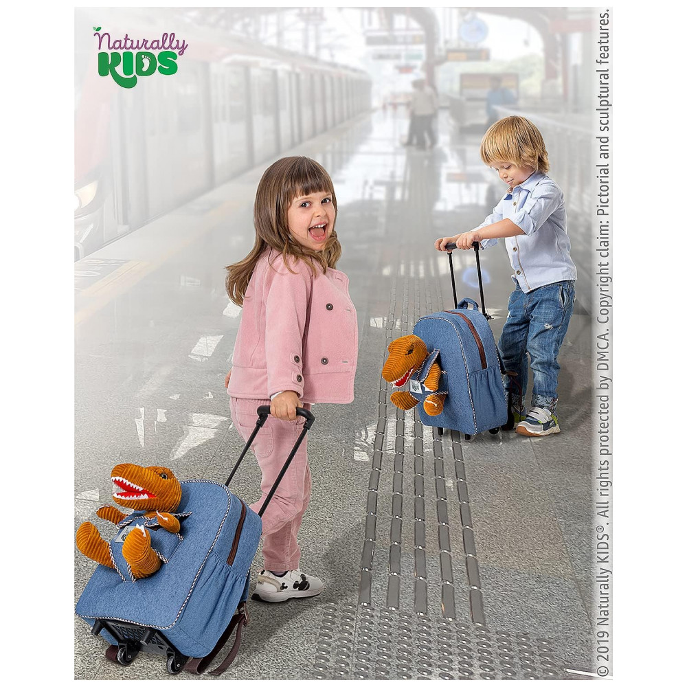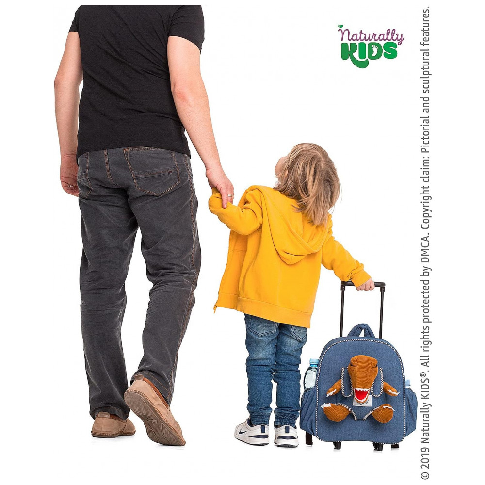 A mala infantil de rodinhas Naturally KIDS com dinossauro foi desenvolvida para crianças de aproximadamente 3 a 6 anos, combinando função de mala de viagem infantil com mochila sobre rodas para passeios, viagens curtas e uso em finais de semana. O design traz um dinossauro de pelúcia removível na parte frontal, que pode ser utilizado como brinquedo separado, mantendo o tema de dinossauro para crianças que gostam desse universo.