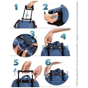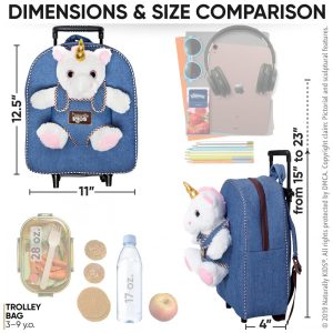 A estrutura tipo trolley conta com alça retrátil, rodinhas e alças de ombro acolchoadas ajustáveis, permitindo uso tanto como mala de rodinhas quanto como mochila nas costas. O compartimento principal com zíper acomoda roupas leves, brinquedos e itens pessoais, com organização interna, bolsos laterais, etiqueta para nome e detalhe refletivo para maior visibilidade.