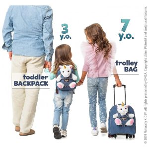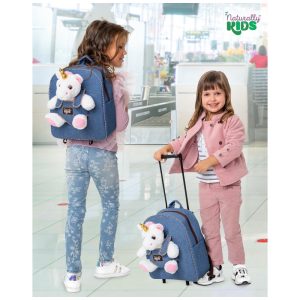 A mochila infantil de rodinhas Naturally KIDS com unicórnio foi desenvolvida para crianças de 3 a 6 anos, combinando função de mala de viagem com formato compacto para passeios e viagens curtas. O design integra um unicórnio de pelúcia removível na parte frontal, que pode ser usado separadamente como brinquedo em casa ou durante o trajeto.