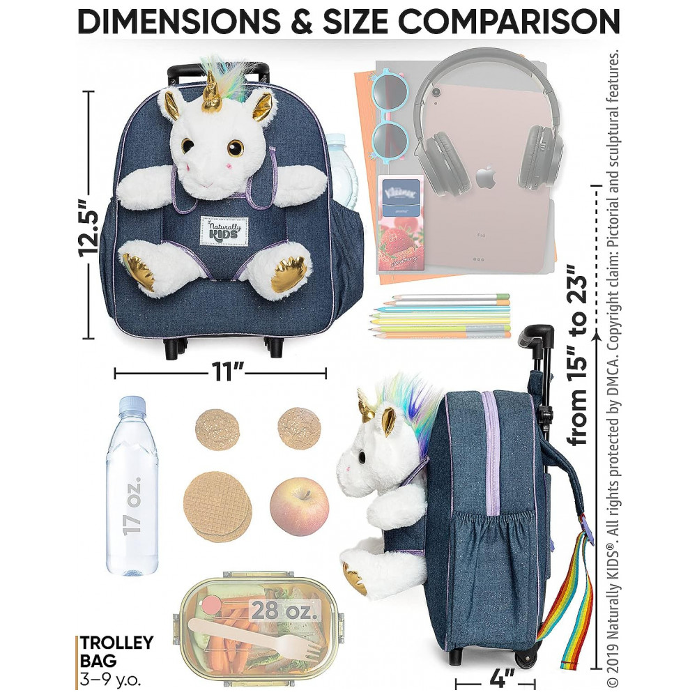 A mochila infantil de rodinhas Naturally KIDS com unicórnio foi desenvolvida para crianças a partir de 3 anos, combinando mochila com carrinho integrado e brinquedo de pelúcia removível na parte frontal. A estrutura em formato de trolley facilita o transporte por rodinhas, enquanto o compartimento principal comporta roupas leves, lanches e brinquedos para viagens curtas e passeios.