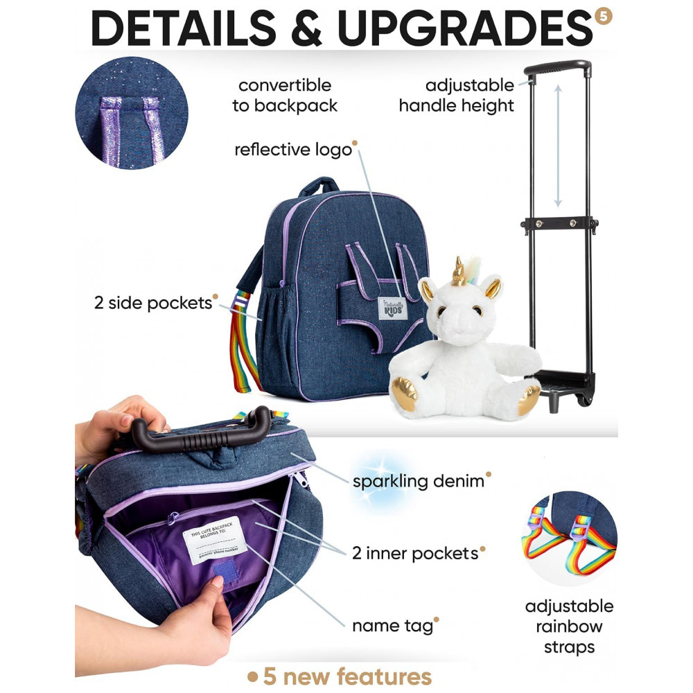 O acabamento em tecido tipo jeans com brilho e estampa temática de unicórnio é complementado por alças acolchoadas ajustáveis e alça retrátil para transporte como mala de mão. O modelo inclui bolsos internos e laterais, logotipo refletivo para maior visibilidade e etiqueta interna para identificação com nome da criança.