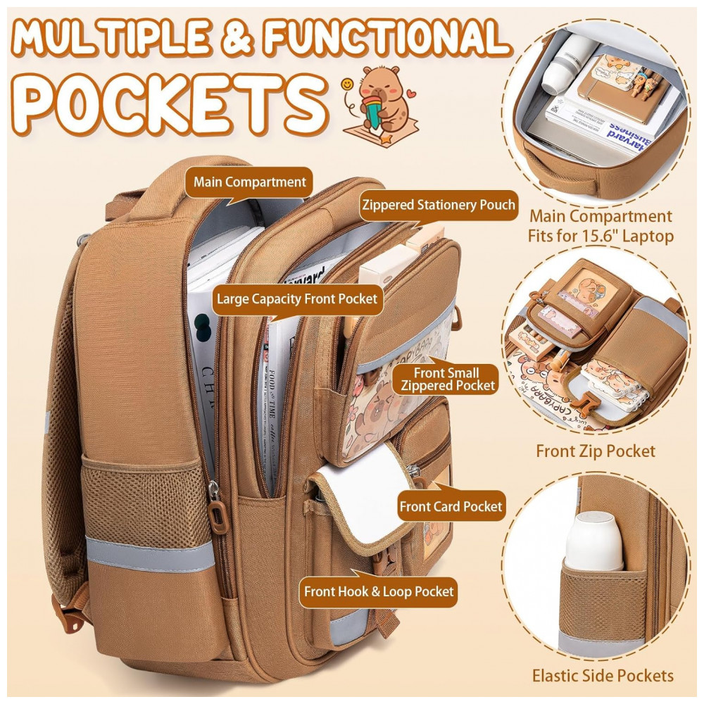 Bolsos frontais: 3 bolsos com zíper para estojo, cadernos menores e acessórios