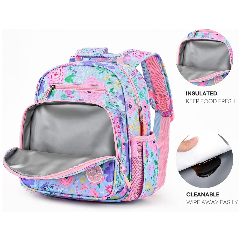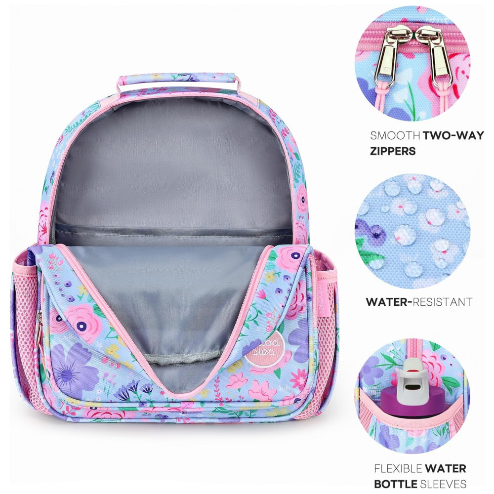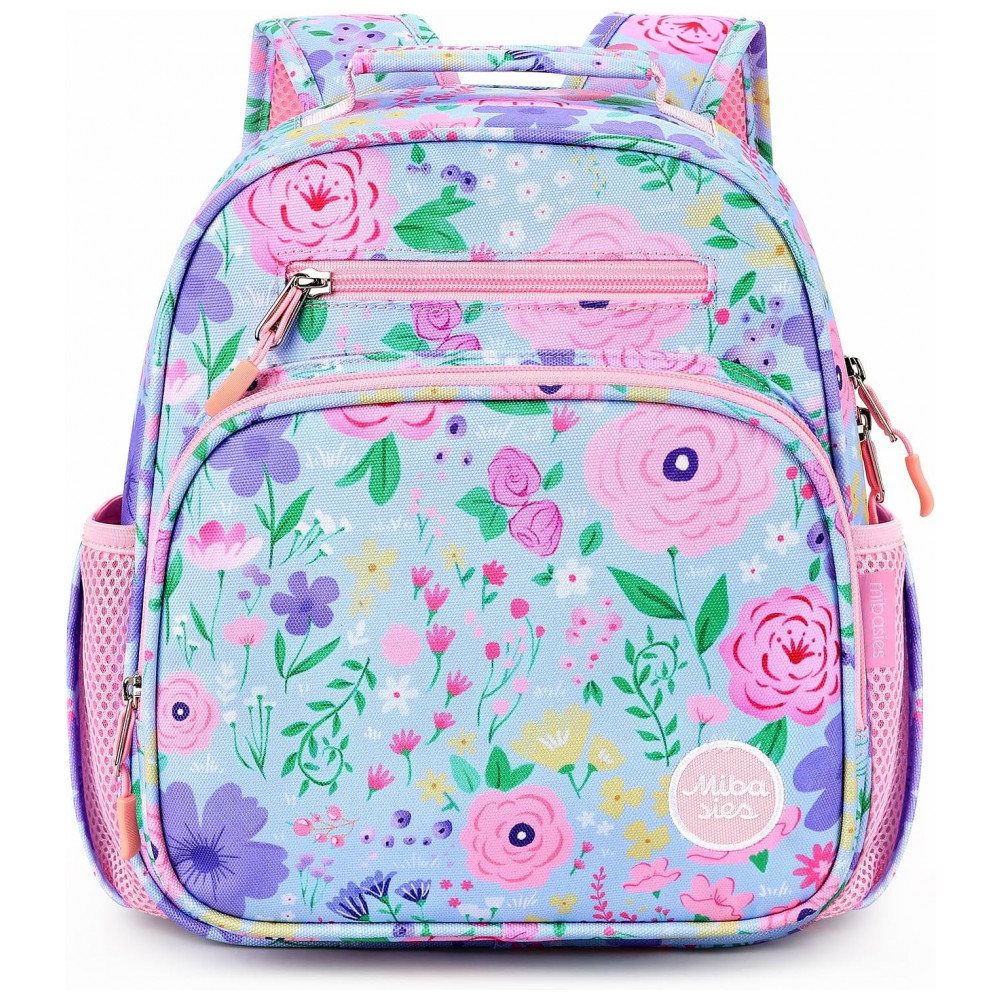 A mochila infantil mibasies floral azul clara foi desenvolvida para crianças de 2 a 4 anos, com capacidade de 7 litros e dimensões compactas para uso em pré-escola, jardim de infância e passeios diários. O modelo combina um compartimento principal para livros e roupas com bolso frontal térmico para lanches, além de bolsos laterais para garrafas ou guarda-chuva infantil.