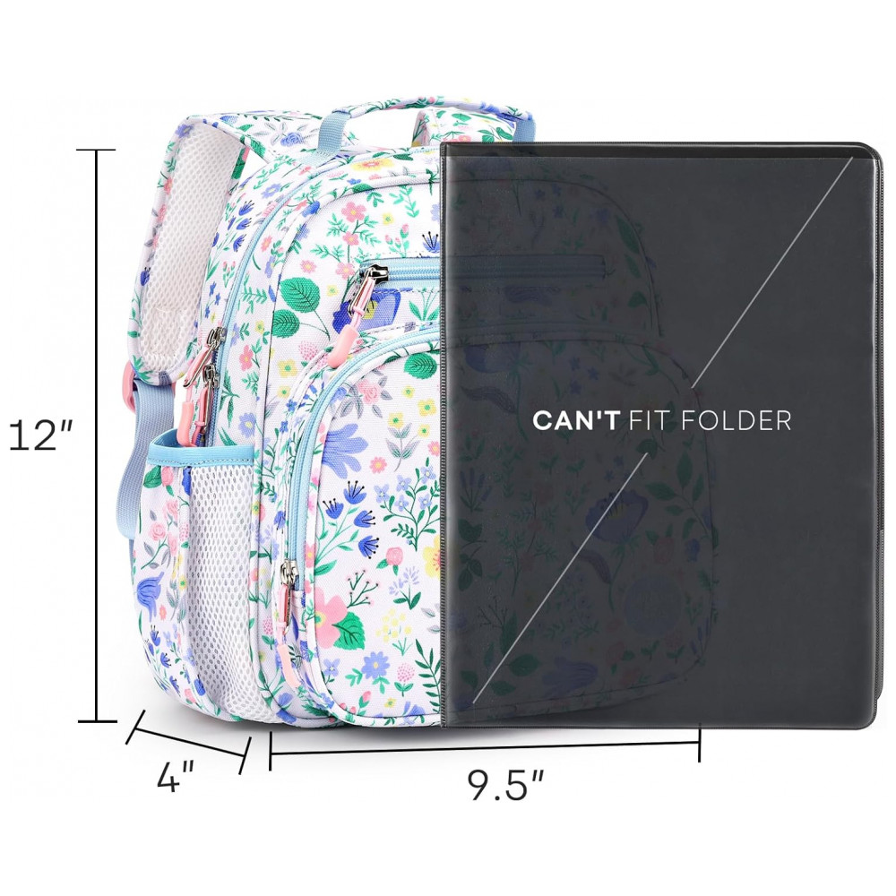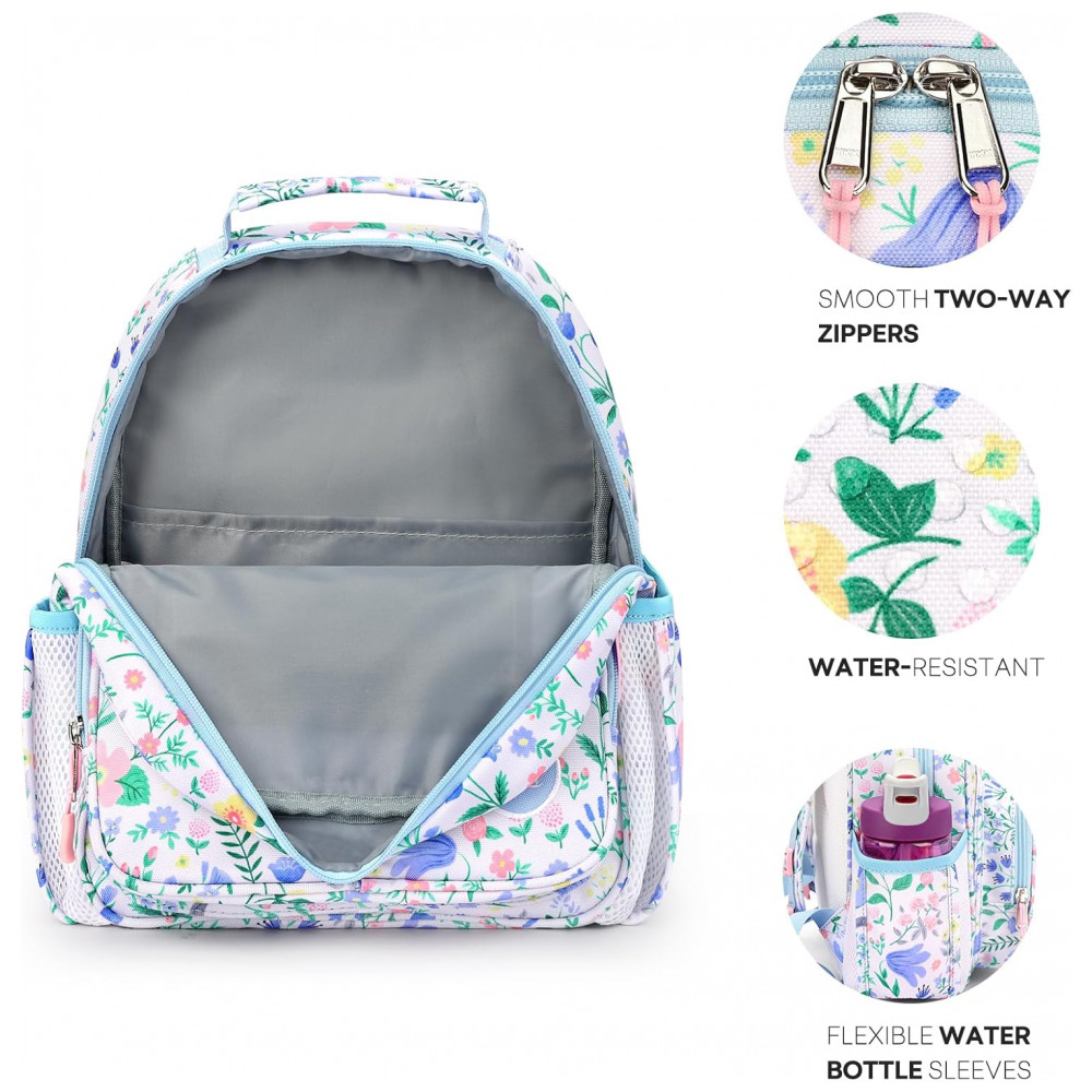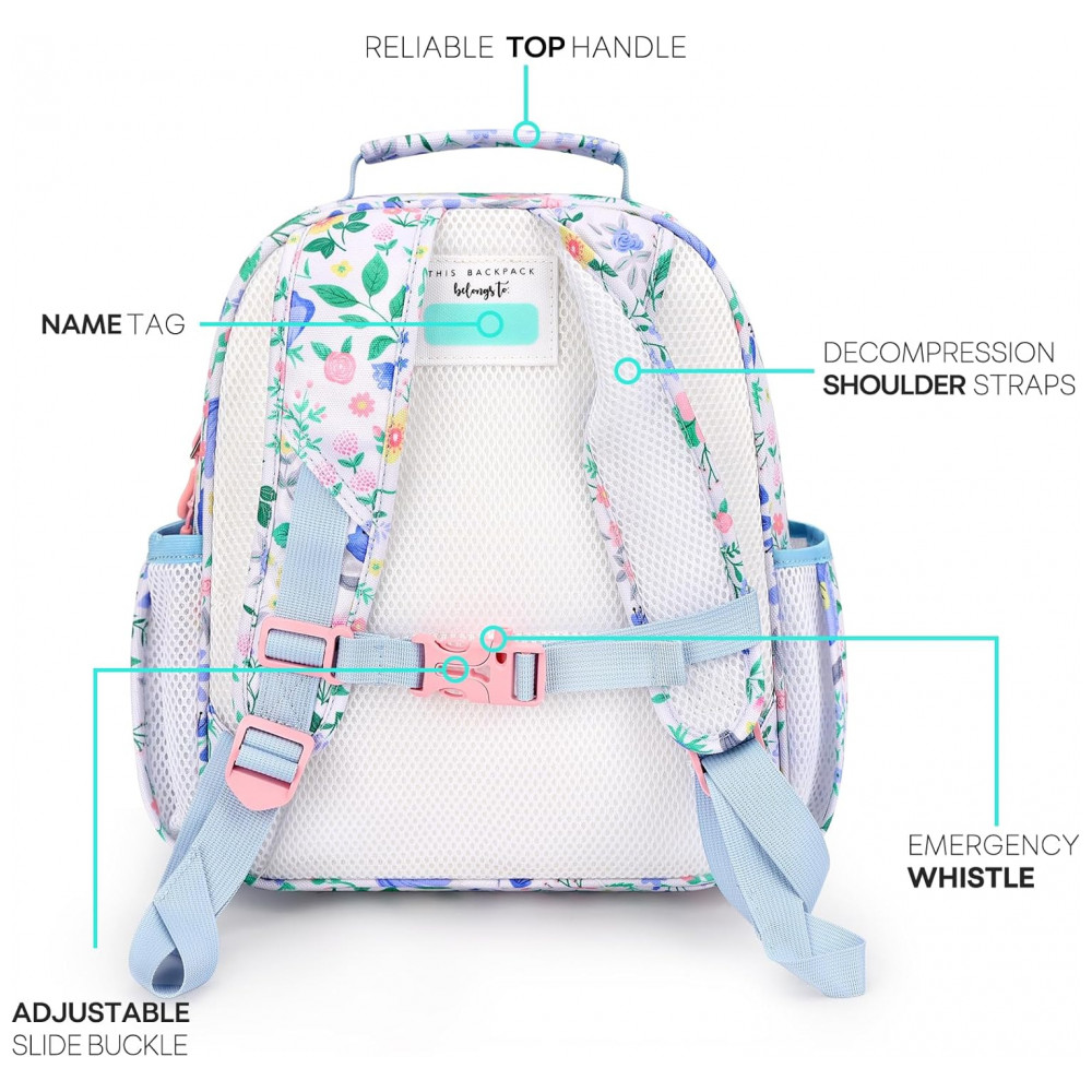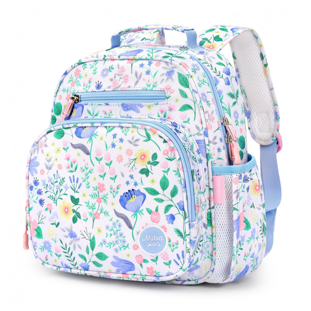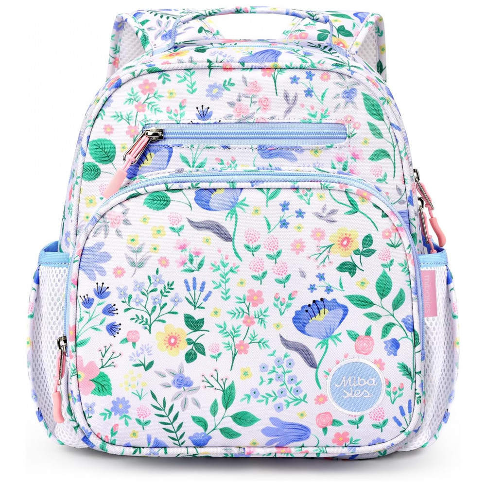 A mochila infantil mibasies floral azul foi desenvolvida para crianças de 2 a 4 anos, com capacidade de 7 litros em formato leve para uso em pré-escola, jardim de infância e passeios curtos. O modelo combina compartimento principal para livros e roupas com bolso frontal térmico para lanches, além de bolsos laterais para garrafas e guarda-chuva infantil.