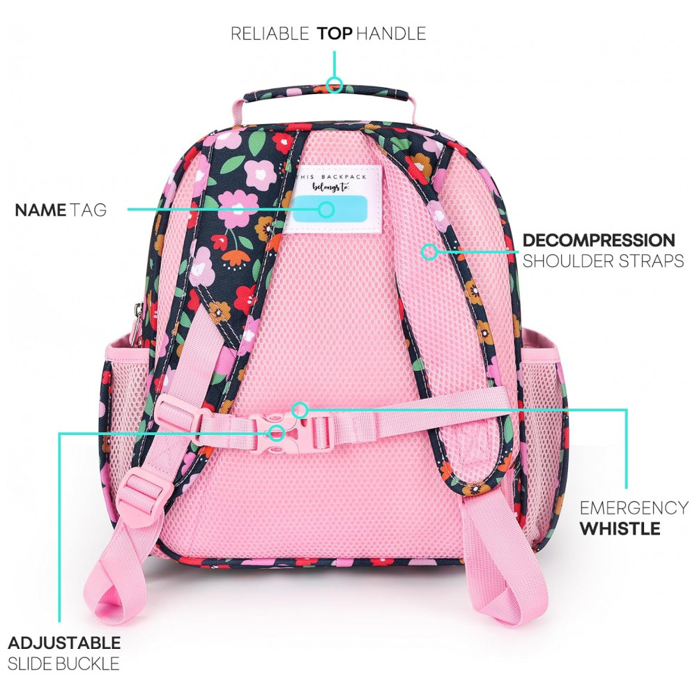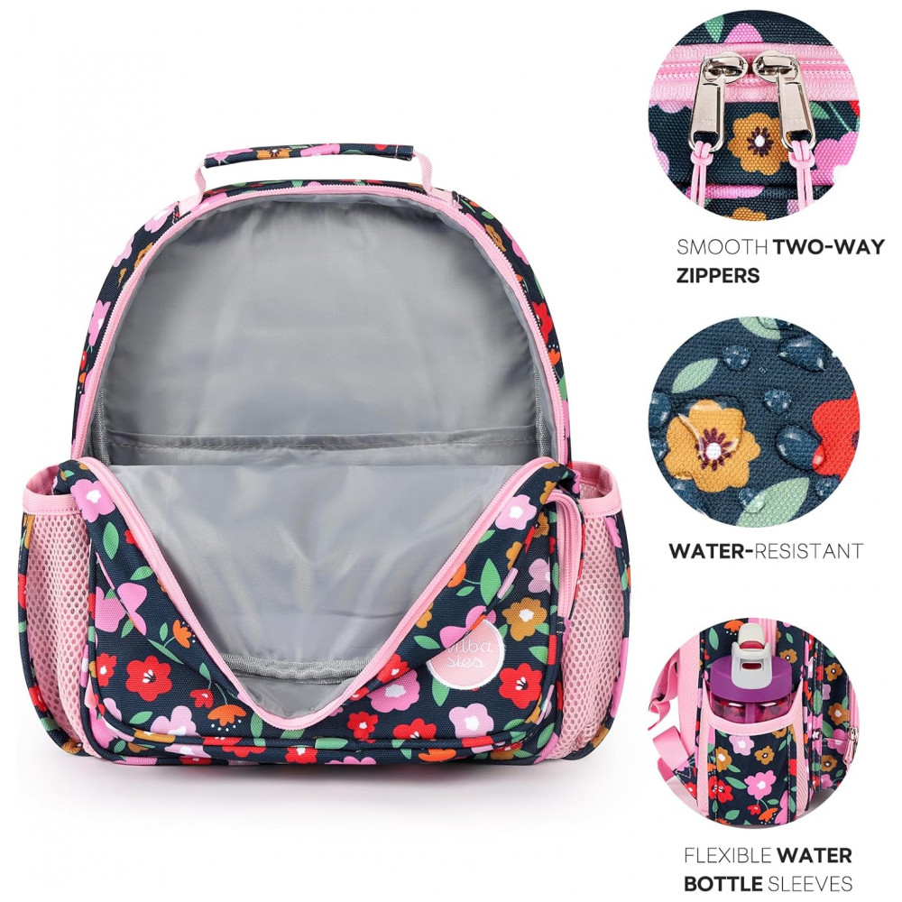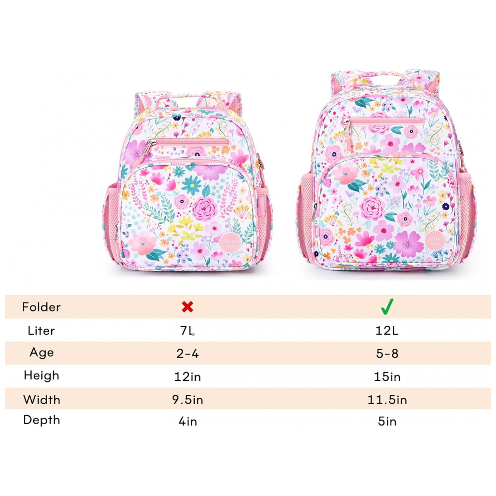 A mochila infantil mibasies floral foi desenvolvida para crianças de 2 a 4 anos, com capacidade de 7 litros em estrutura leve e resistente para uso em pré-escola, jardim de infância e passeios curtos. O modelo combina compartimento principal para livros e roupas leves com bolso frontal térmico para lanches, além de bolsos laterais para garrafa de água ou guarda-chuva infantil.