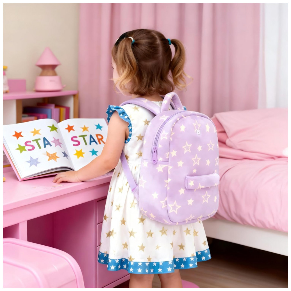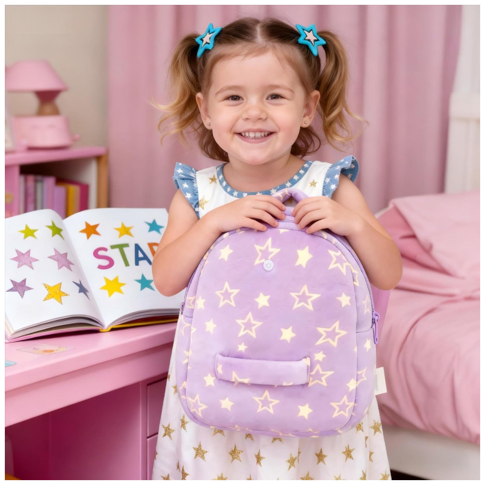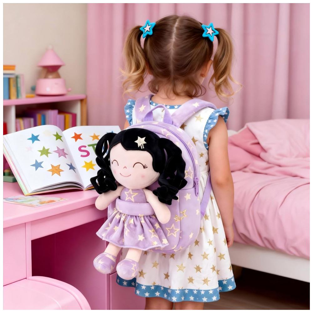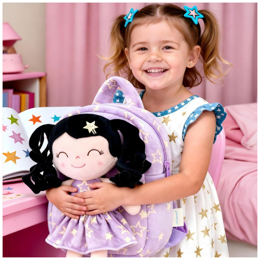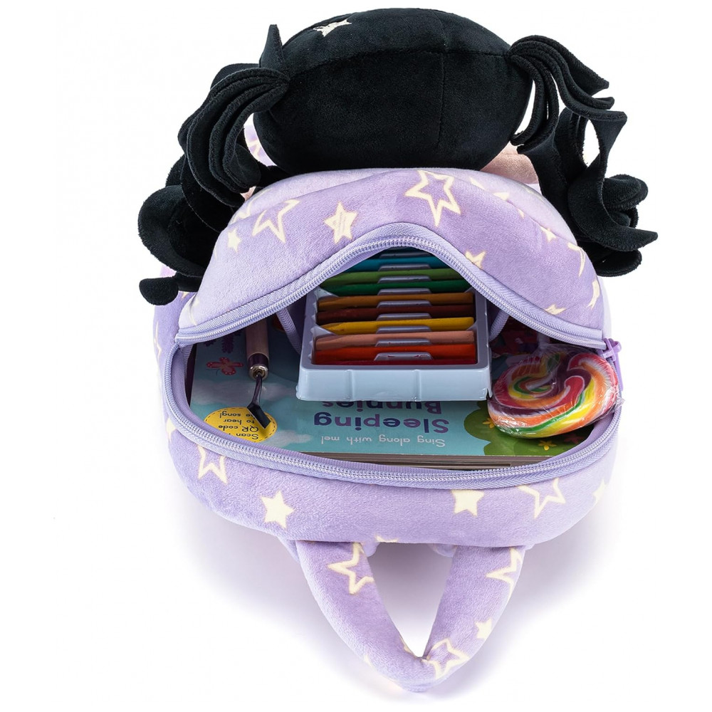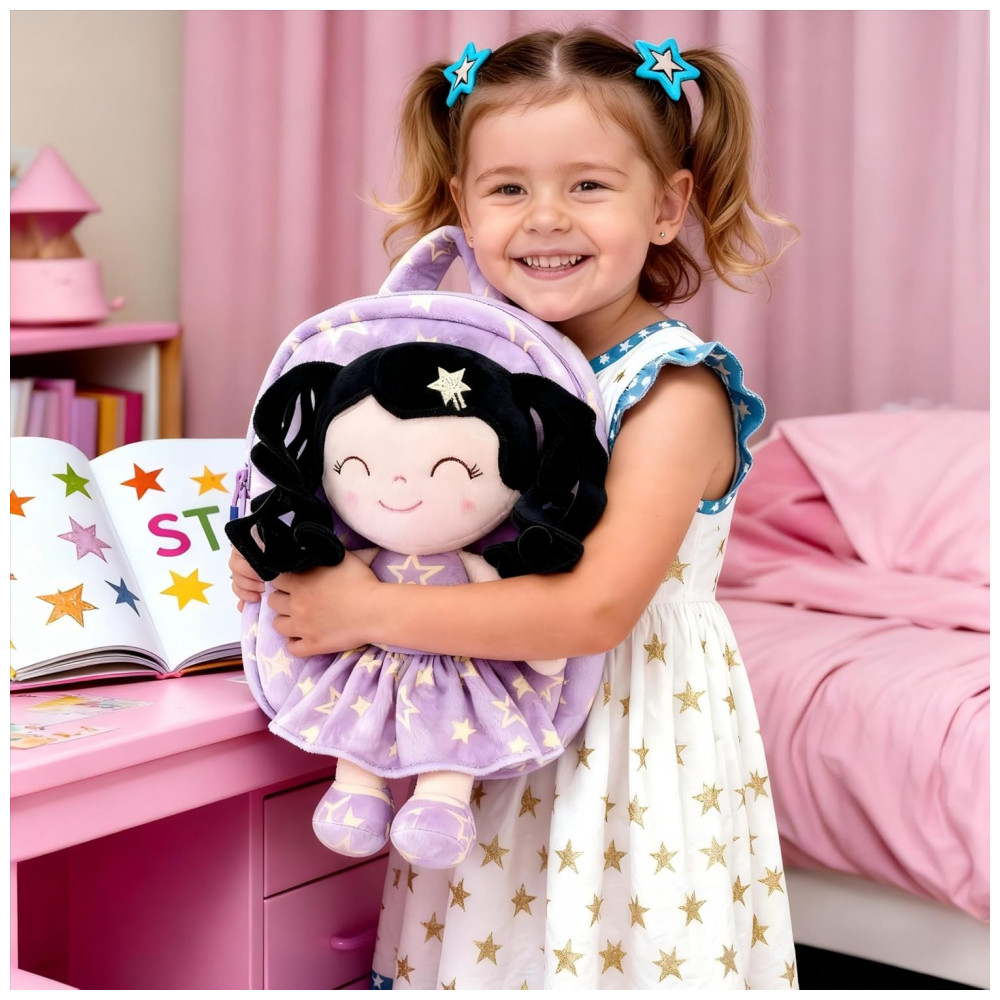 A mochila infantil Gloveleya boneca primavera é indicada para crianças pequenas, com estrutura em pelúcia macia em formato de boneca de cabelo cacheado, vestido com estampa de estrelas roxas e compartimento principal adequado para lanches, pequenos brinquedos e objetos pessoais leves, em tamanho compacto adequado ao uso diário infantil em passeios, escola infantil e atividades de lazer.