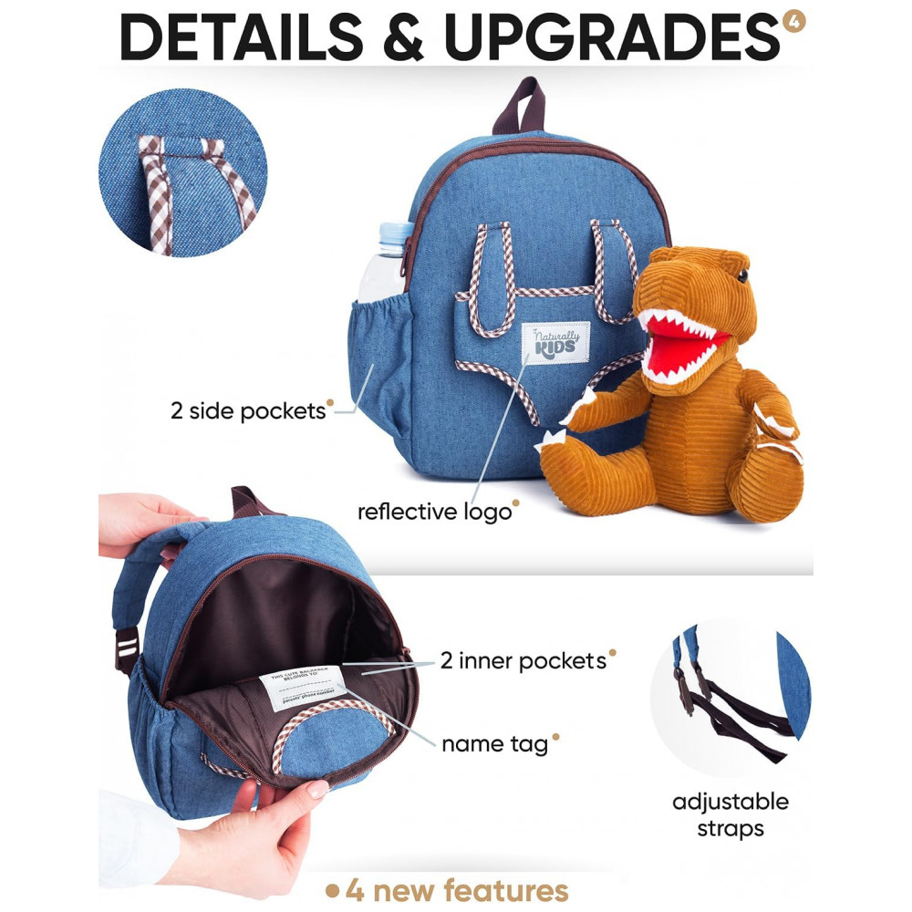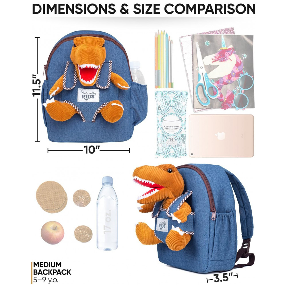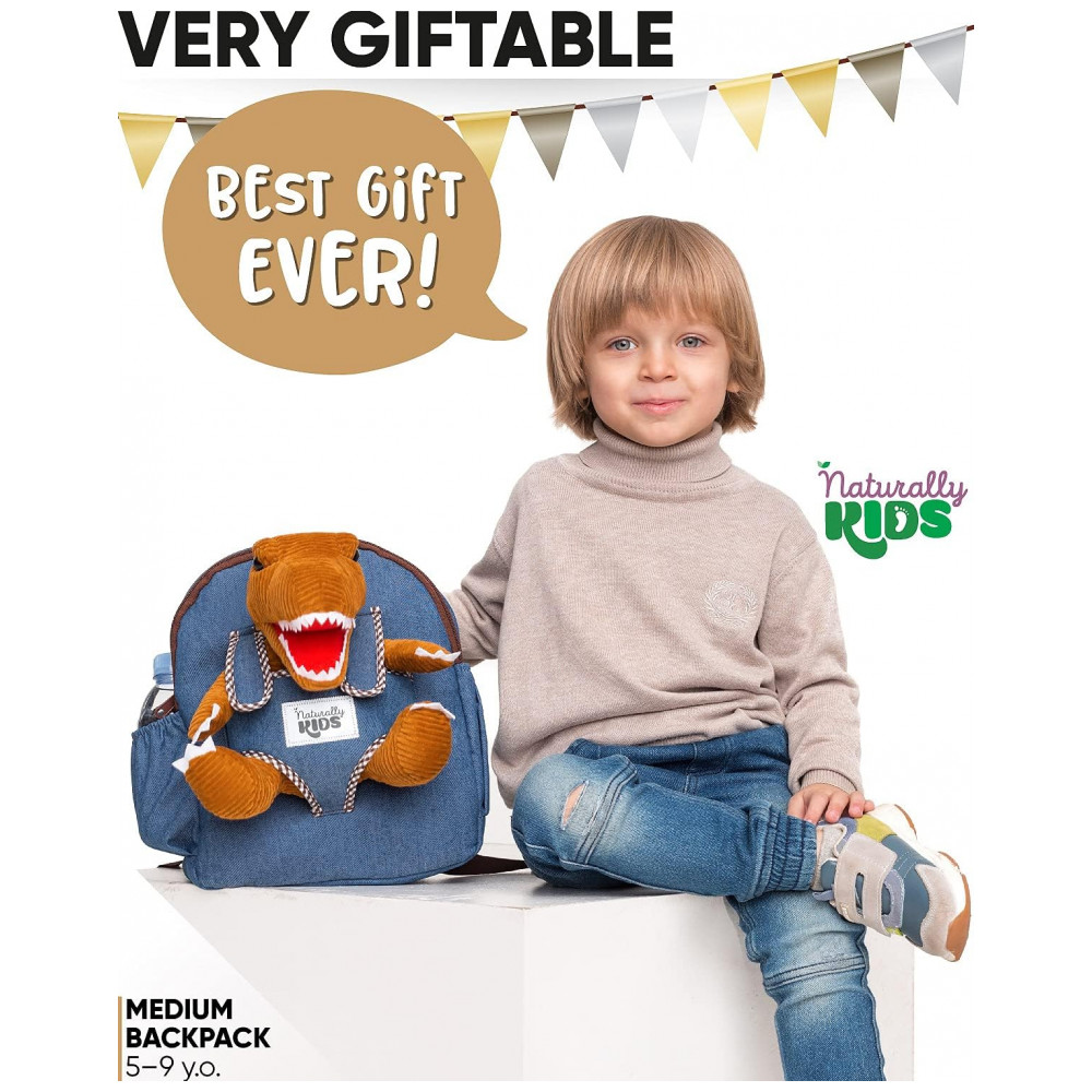 A mochila infantil média Naturally KIDS dinossauro foi desenvolvida para crianças de aproximadamente 5 a 7 anos, com capacidade para uso em passeios, escola e pequenas viagens. A parte frontal traz um dinossauro de pelúcia removível, que pode ser utilizado separadamente como brinquedo e companheiro de viagem, mantendo o visual lúdico para crianças que gostam de dinossauros.