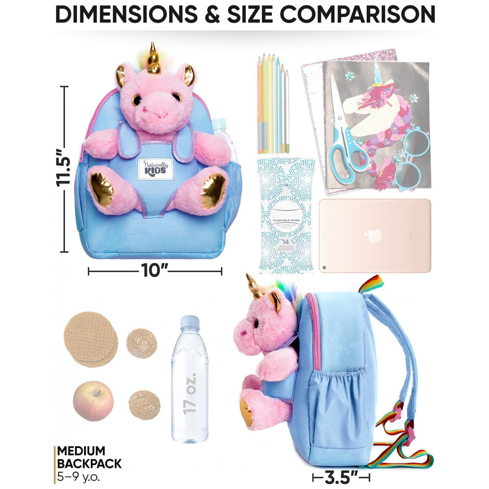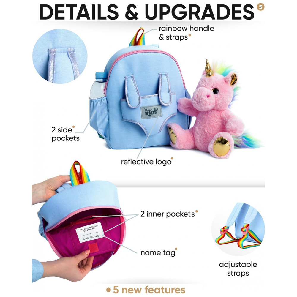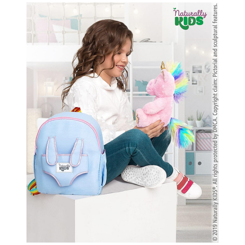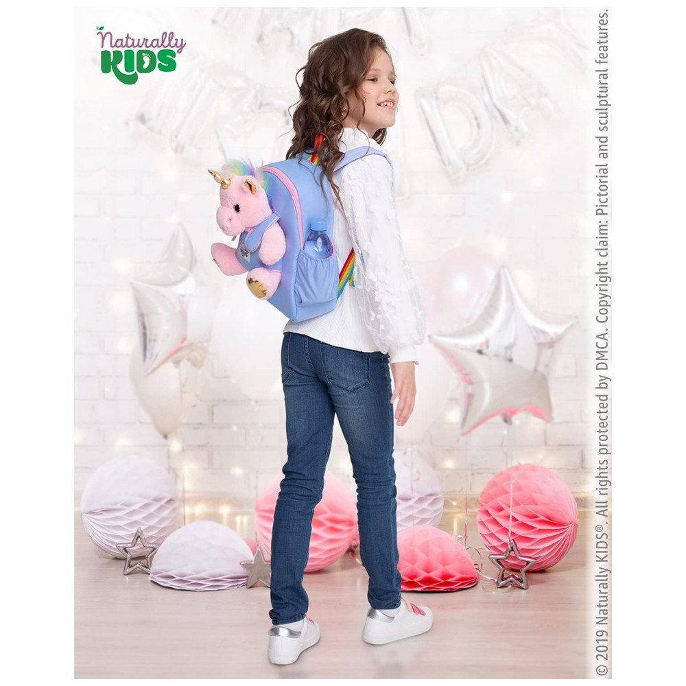 A mochila infantil média Naturally KIDS com unicórnio rosa foi desenvolvida para crianças em idade pré-escolar e primeiros anos escolares, com estrutura compacta e leve adequada ao uso diário em passeios, escola e viagens curtas. A peça traz na parte frontal um unicórnio de pelúcia removível, que pode ser utilizado separadamente como brinquedo, mantendo o tema lúdico para crianças que gostam de unicórnios.