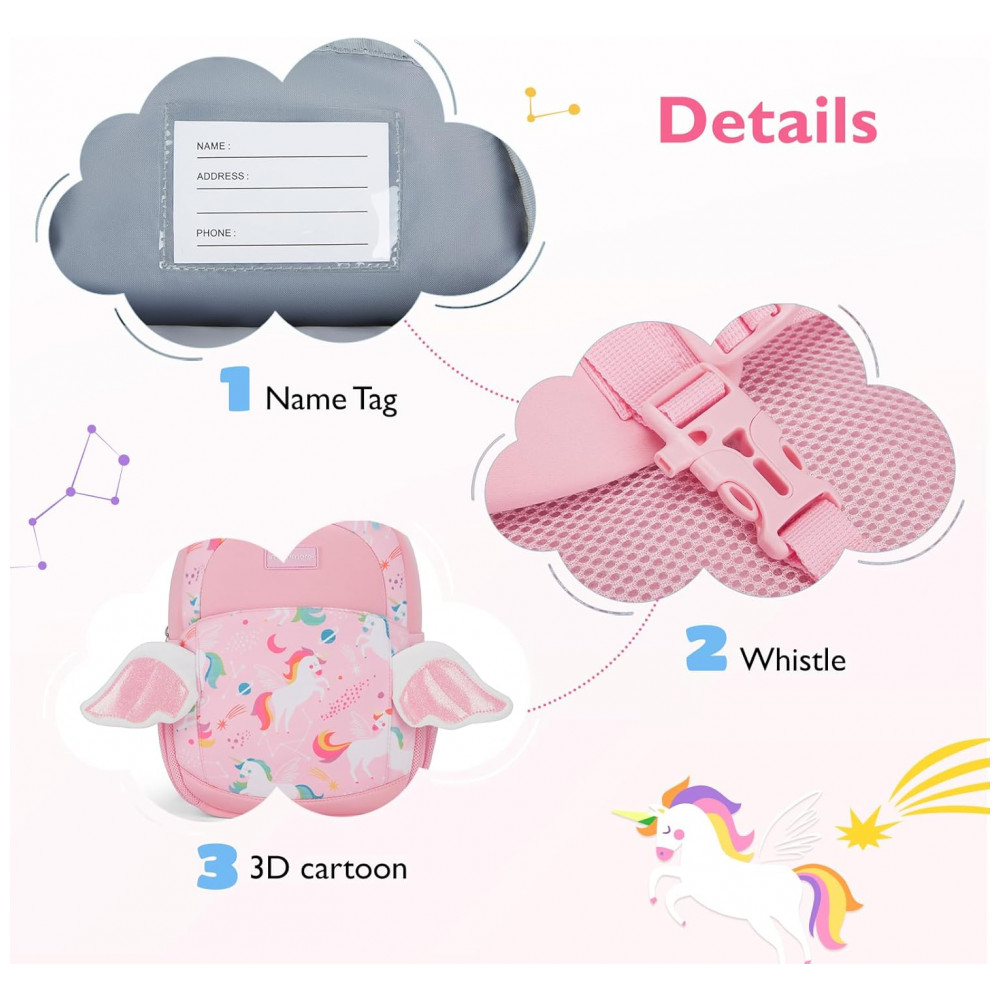 A mochila infantil mommore unicórnio rosa com guia de segurança é indicada para crianças de 2 a 4 anos em uso de creche, pré-escola e passeios, fabricada em neoprene leve, macio e resistente à água, com compartimento principal para brinquedos, roupas leves ou lancheira, bolso frontal aberto de fácil acesso, dois bolsos laterais para garrafinha e alças acolchoadas ajustáveis com tira peitoral, além de guia destacável para manter a criança próxima em ambientes movimentados.