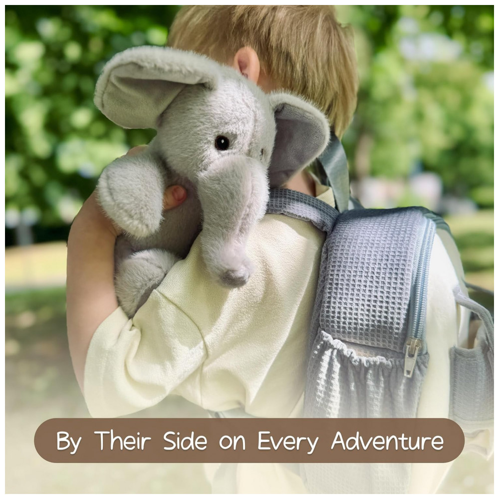 Mochila infantil em pelúcia com formato de elefante, desenvolvida para crianças a partir de aproximadamente 18 meses até cerca de 4 anos, ideal para uso em creche, pré‑escola, passeios e viagens curtas. O produto utiliza materiais macios com olhos bordados e segue padrões de segurança de brinquedos, com tamanho compacto adequado para que a criança leve pequenos pertences como lanchinhos, brinquedos e acessórios.